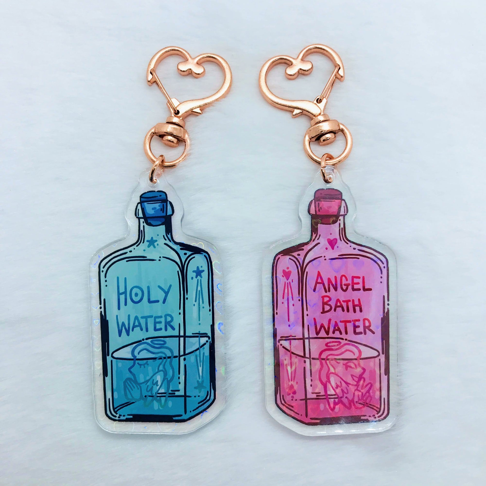 A troubling revelation about holy water... The keychain is 2.5 inches (6.3 cm) long, made with holographic heart acrylic. It has a blue bottle of holy water on one side, and a pink bottle of angel bath water on the other. The keychain has a rose gold heart-shaped clasp.