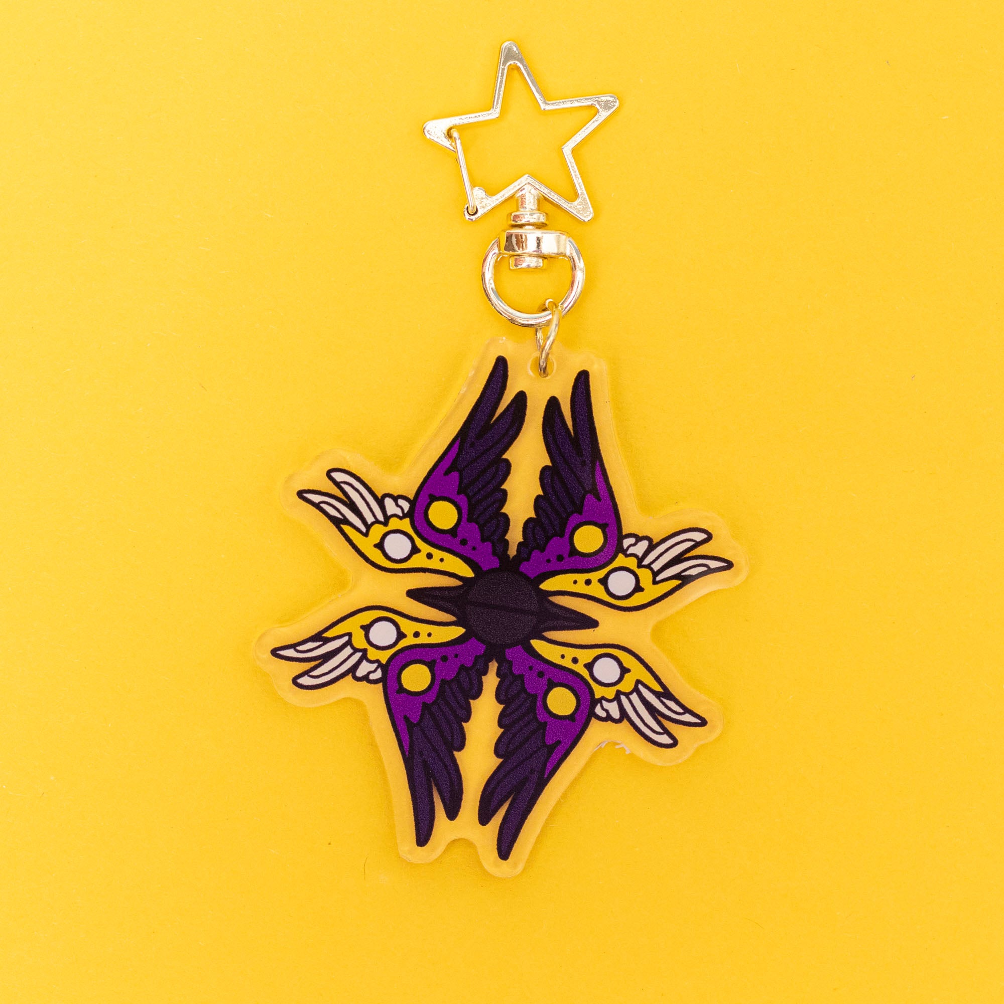 A black hole seraph with purple and yellow wings, for Nonbinary pride.This acrylic keychain is 2.5 inches (6.3 cm) long, double-sided with the same print on both sides. The keychain has a gold star-shaped clasp.Please note: the keychain comes with protective film that should be peeled off.