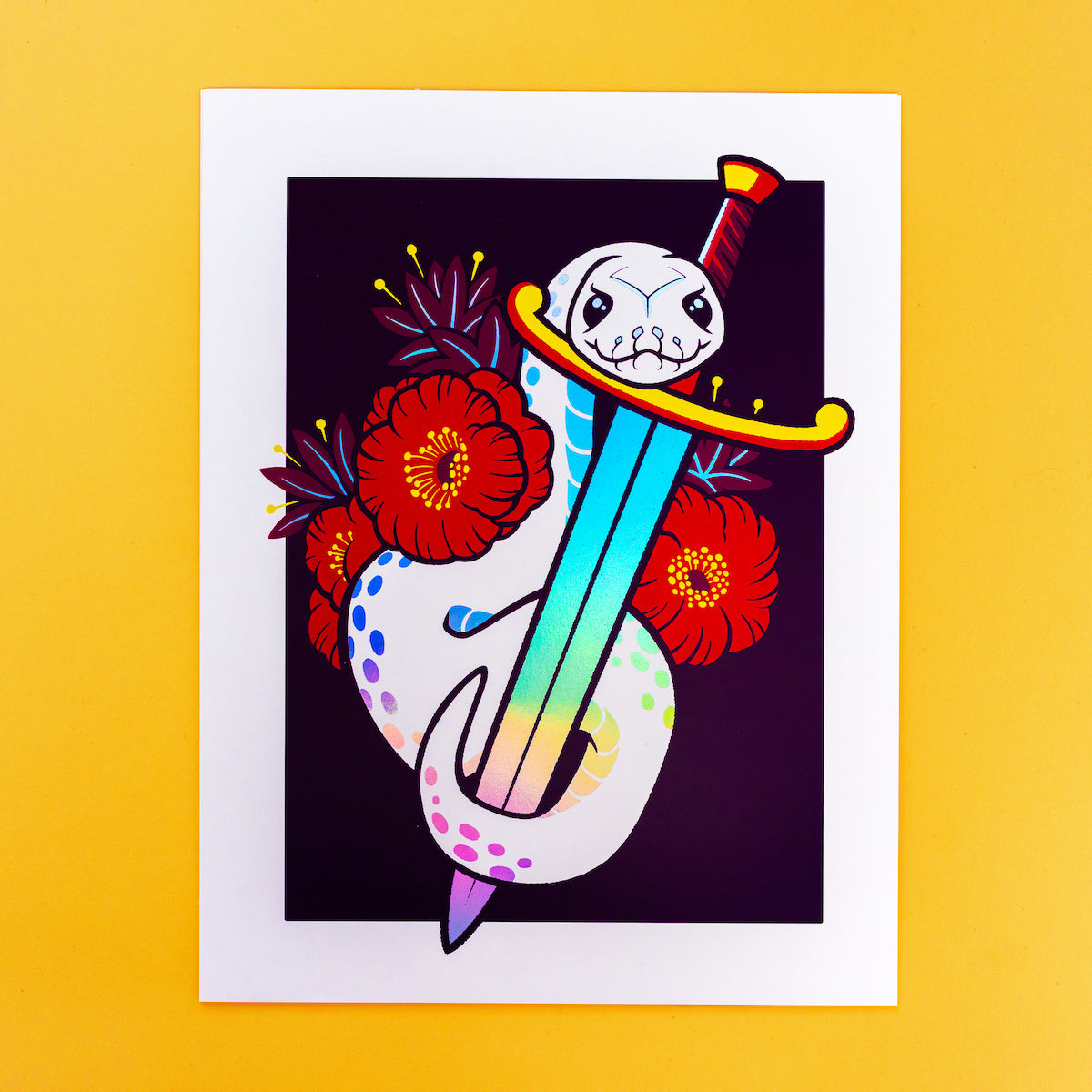 It's a snake, and a sword. A snord. This is a high quality 8"x10" print on smooth paper, with fancy holo foil accents!