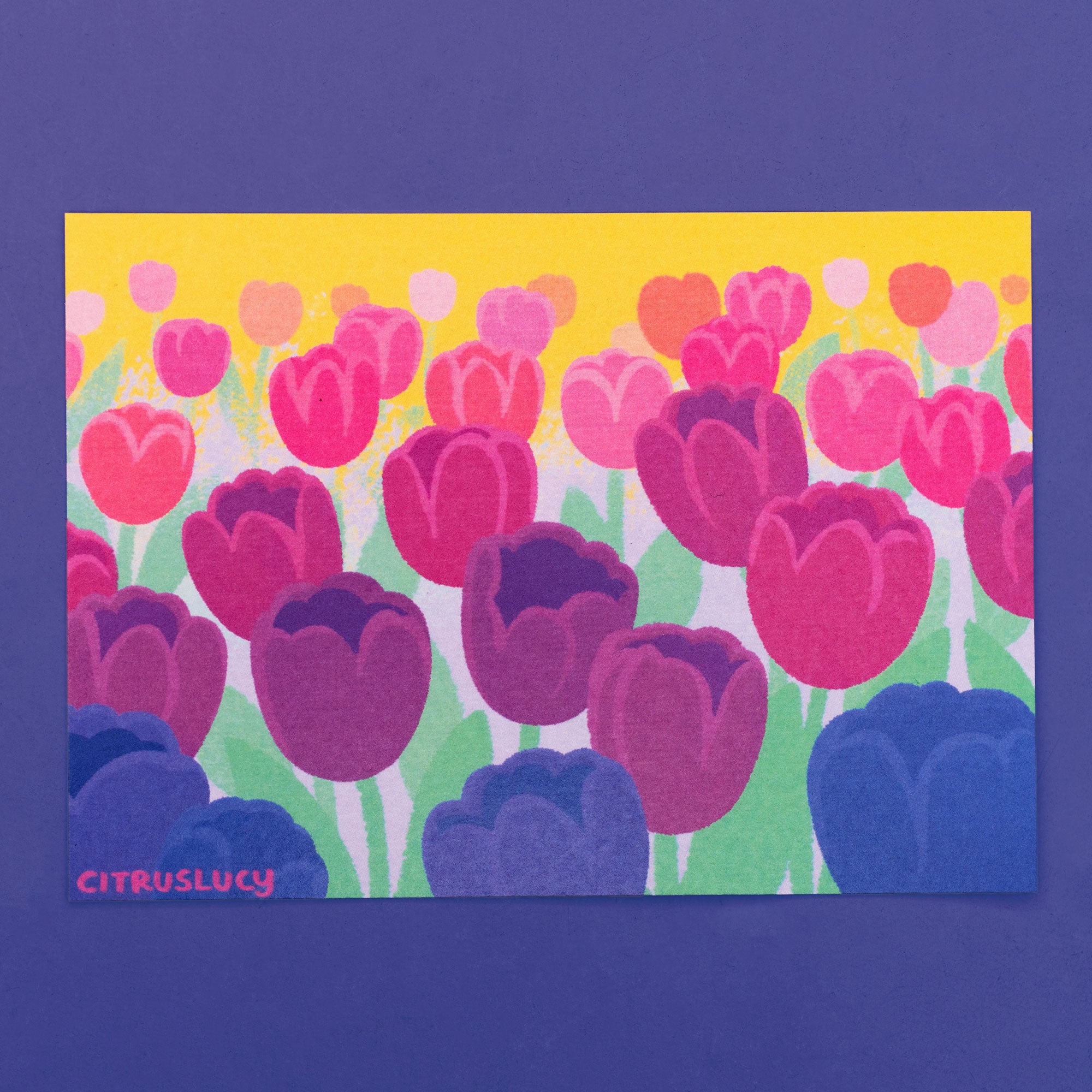 This postcard evokes the bisexual flag through a fresh tulip scene.