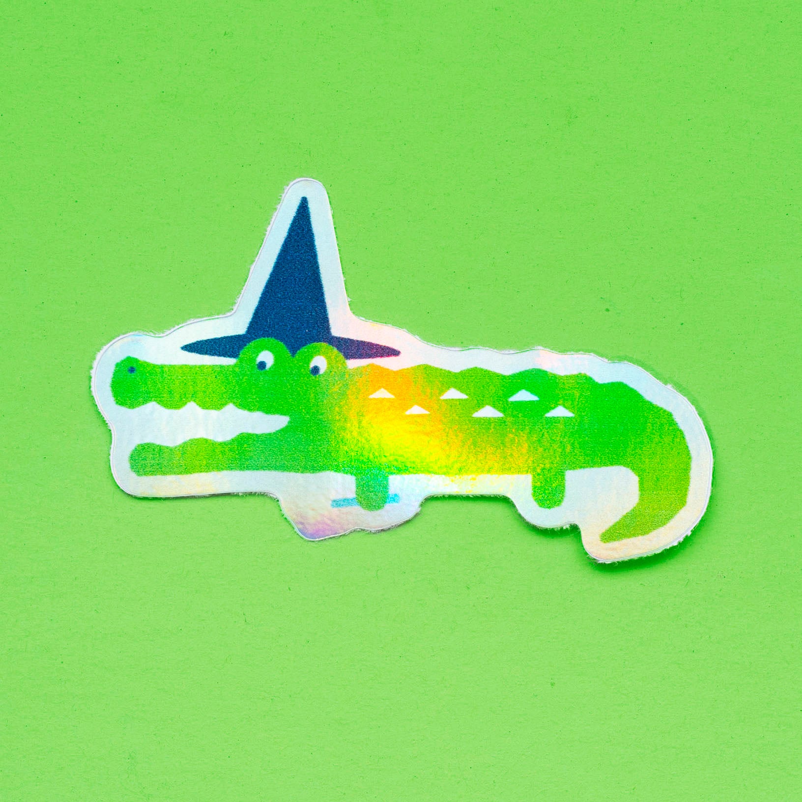 A magical rainbow holographic vinyl sticker featuring a magical wizard alligator.