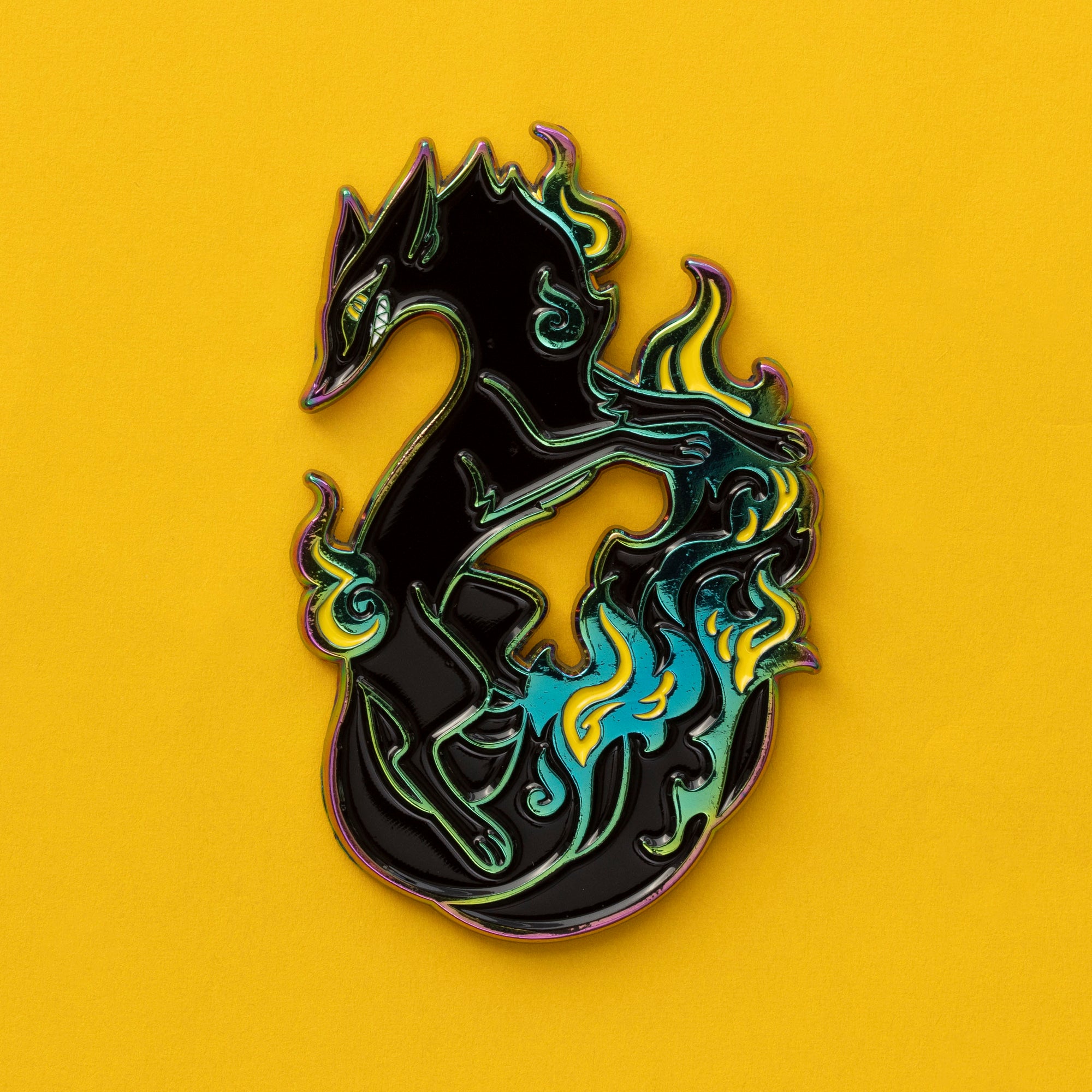This cheeky spookster fox is looking to haunt your hats, bags and pinboards! This soft enamel pin features rainbow metal (so every pin is a little unique!) and currently comes in two colourways (white or black). Do you dare let this mischevious spirit into your home?