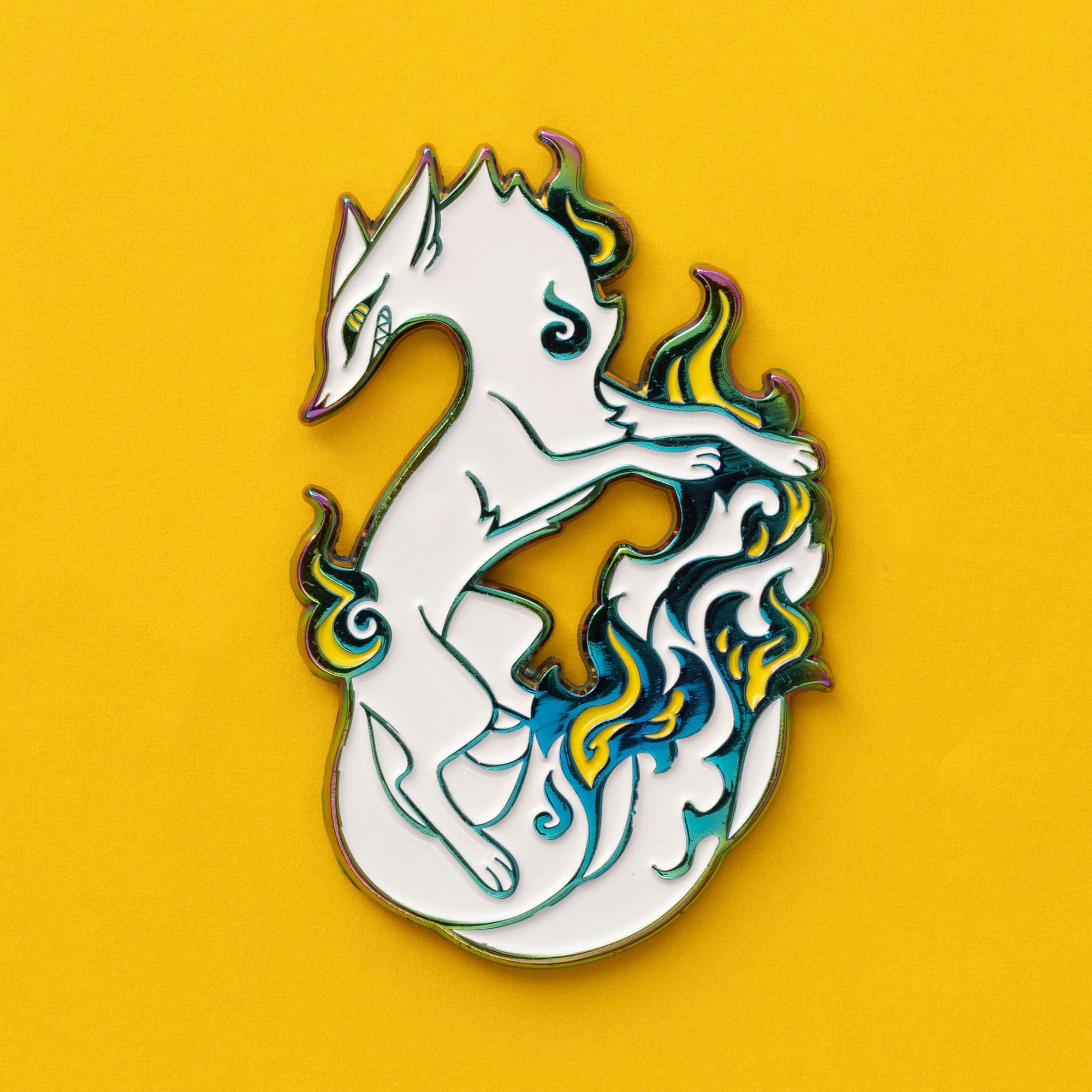 This cheeky spookster fox is looking to haunt your hats, bags and pinboards! This soft enamel pin features rainbow metal (so every pin is a little unique!) and currently comes in two colourways (white or black). Do you dare let this mischevious spirit into your home?