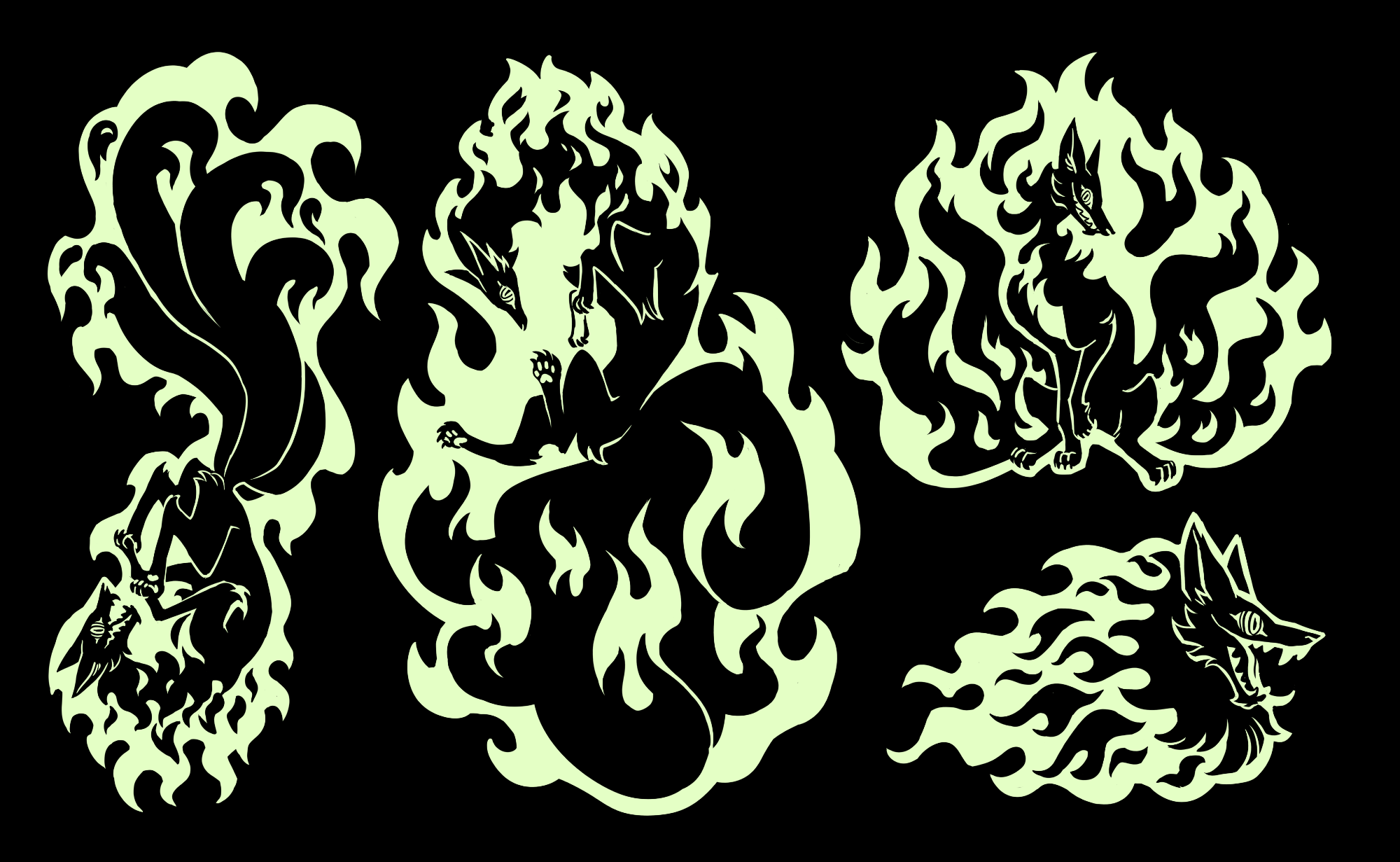 4 more spooky foxes for your spooky fox pile! These spectral silhouettes are printed on glow-in-the-dark matte vinyl so that all the flames will light up in the dark!Make sure to charge the glow material under lights first to get a good strong glow. The brightmess may surprise you!