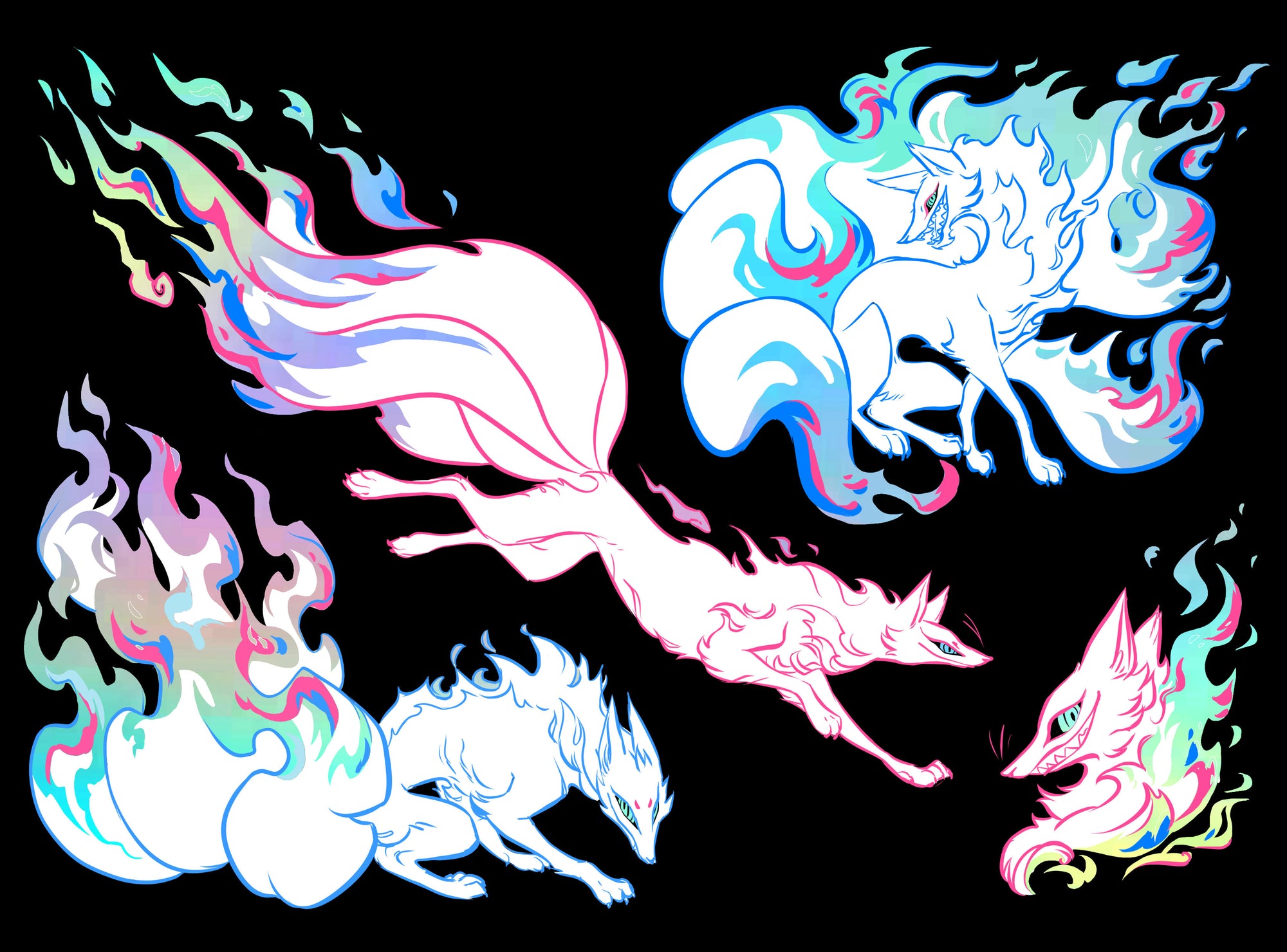 A sticker sheet set of 4 more spooky foxes! These mischievous spirits are printed on holographic vinyl such that their eyes and flames are bright and reflect a rainbow of colours. Each sticker is kiss cut so you can easily peel and apply them! This glossy weatherproof vinyl will hold up to 2-4 years outdoor use / heavy handling too! Great for phones, handheld consoles, vehicles, etc.