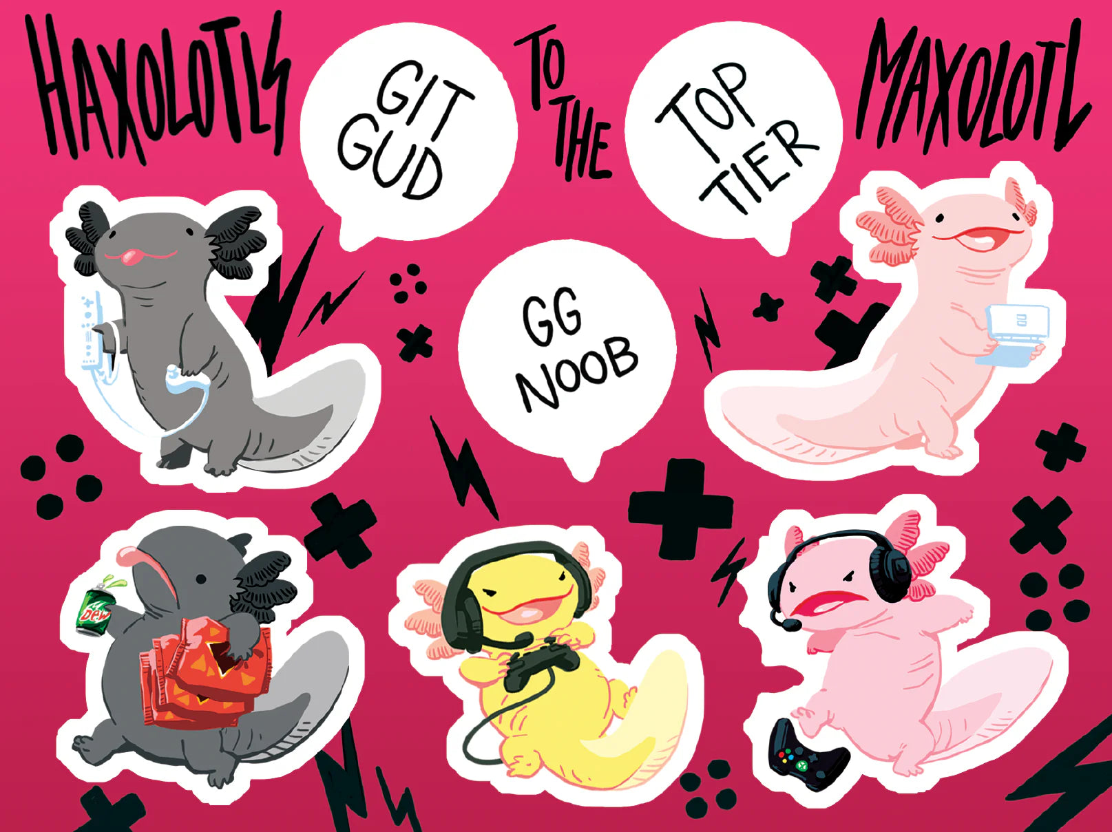 Haxolotls to the Maxolotl! Some, uh (cute?) gamer axolotl and gamer slang speech bubble stickers! Each sticker is kiss cut so that you can easily peel them off the sheet. Mix and match the speech bubbles with the haxolotls as you please! This glossy weatherproof clear vinyl will hold up to years of outdoor use / heavy handling too! Great for phones, handheld consoles, vehicles, etc. The clear vinyl edges means the haxolotls will look good without a white border wherever you stick them.