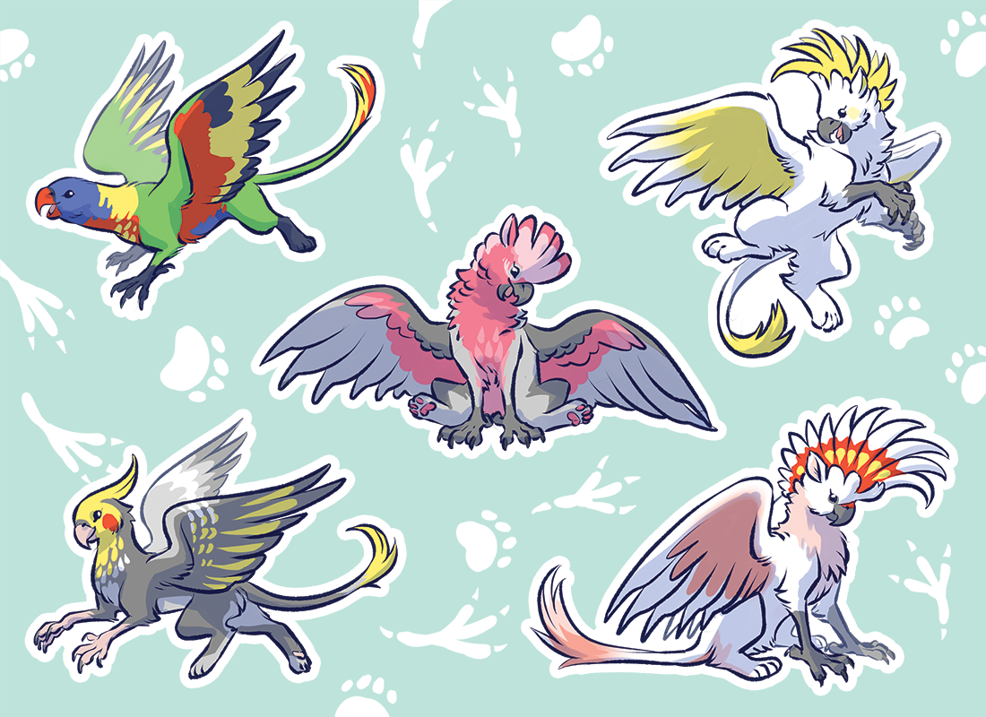 Australia parrots are the best parrots and sometimes they are also the best griffins!! These fabulous agents of chaos are now available as vinyl stickers. :) There are two sheets of designs available so choose the one you like best or get both together for a small discount! The individual griffins are kiss cut so that you can easily peel off each sticker from the sheet. The full sticker sheet measures approx 4x6". This sturdy weatherproof glossy vinyl will hold up to years of outdoor use and heavy handling! Great for phones, handheld consoles, vehicles, etc.