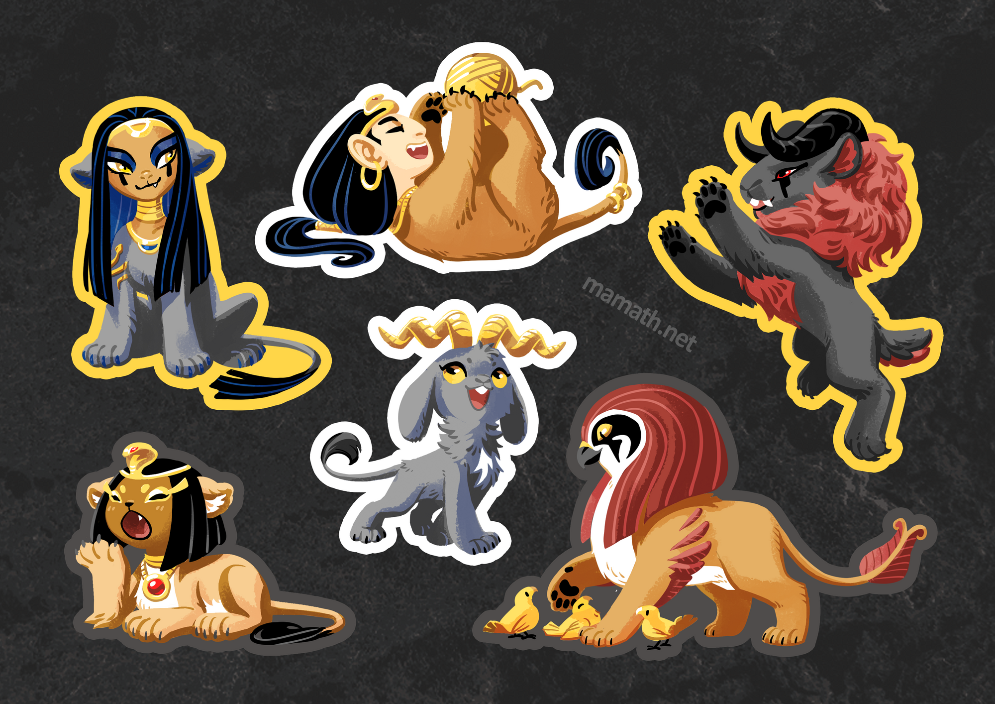 This 4x5.5" sticker sheet features 6 different kinds of Egyptian sphinxes! Sphinxes, Criosphinxes, Hieracosphinxes, boy-o we got em all. Printed on gloss-metallic vinyl so that the gold parts and really "gold" and kiss cut so that each character peels off the background with ease. Will hold up to 2-4 years outdoor use!