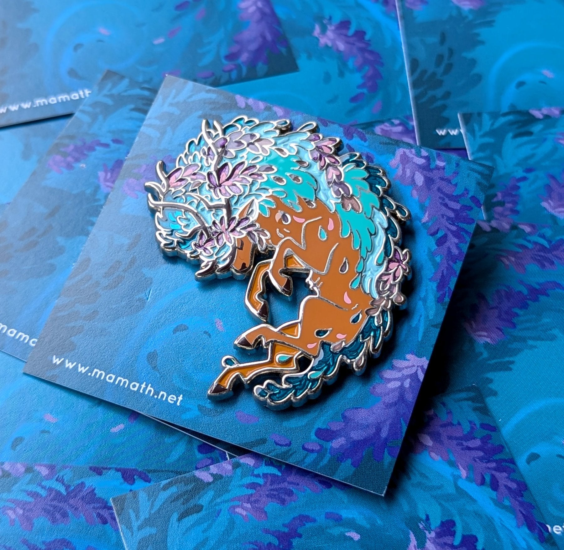 This hybrid enamel pin (using both soft and hard enamel together to create extra depth) features recessed metal details beneath translucent enamel as well as screen printed details. It was produced as part of the Wild Advent: Spring Awakening KS campaign, a large enamel pin collaboration project with many other artists!