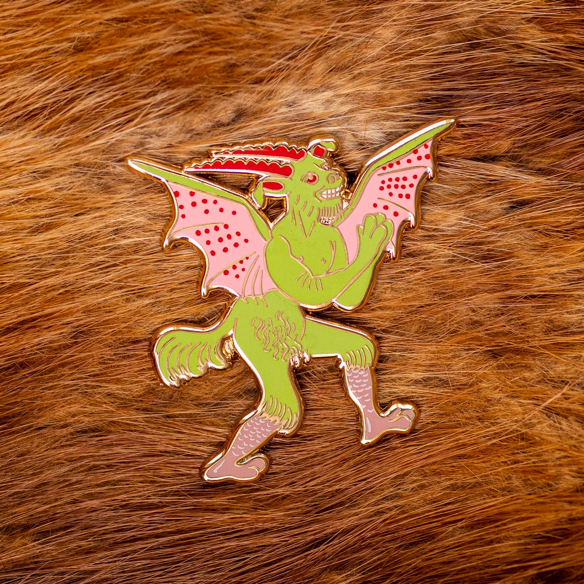This Pious Prince of the Underworld is Belial. The manuscript this illumination is from depicts the story of the Devil taking Jesus Christ to court and suing him for entering Hell. 1.8 inch hard enamel pin, gold plated, two colour screenprint, two posts, rubber clutches & back stamp.