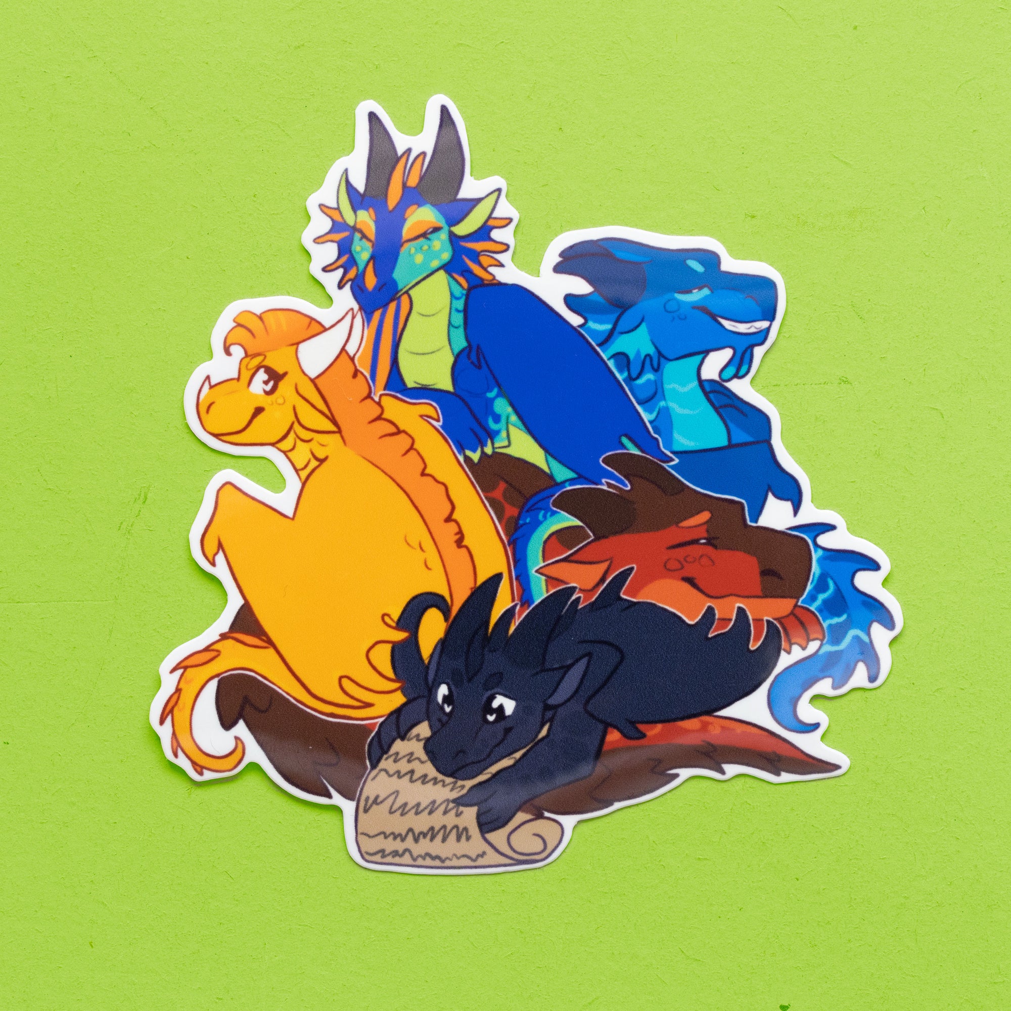 This illustrated fan art vinyl sticker is a delightful depiction of the Dragonets of Destiny from the popular Wings of Fire book series. The sticker features all five dragonets - Clay, Tsunami, Glory, Starflight, and Sunny - in a charming and playful pose. The sticker design captures the dragonets' youthful spirit and sense of adventure, making it perfect for fans of the series who want to show their love for the characters. The high-quality vinyl material ensures that the sticker will remain in great condition.