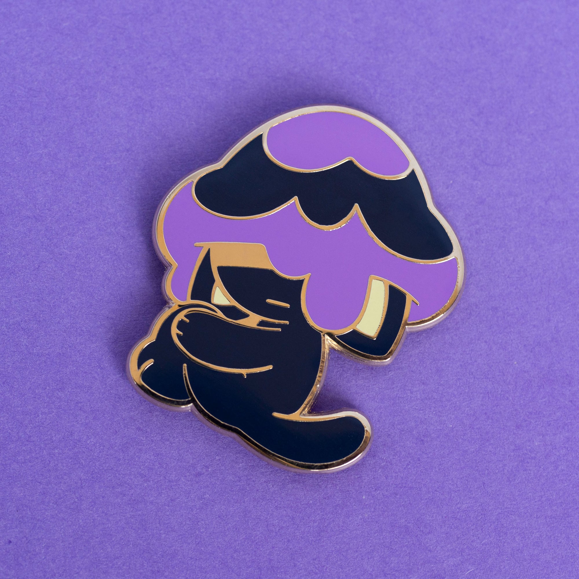 This hard enamel pin is made with gold colored plating and features the mysterious Inky, Mushroomy's bestie! Featuring dual rubber clasps design on the back to keep it securely in place on your jacket, backpack, or wherever you choose to display it.