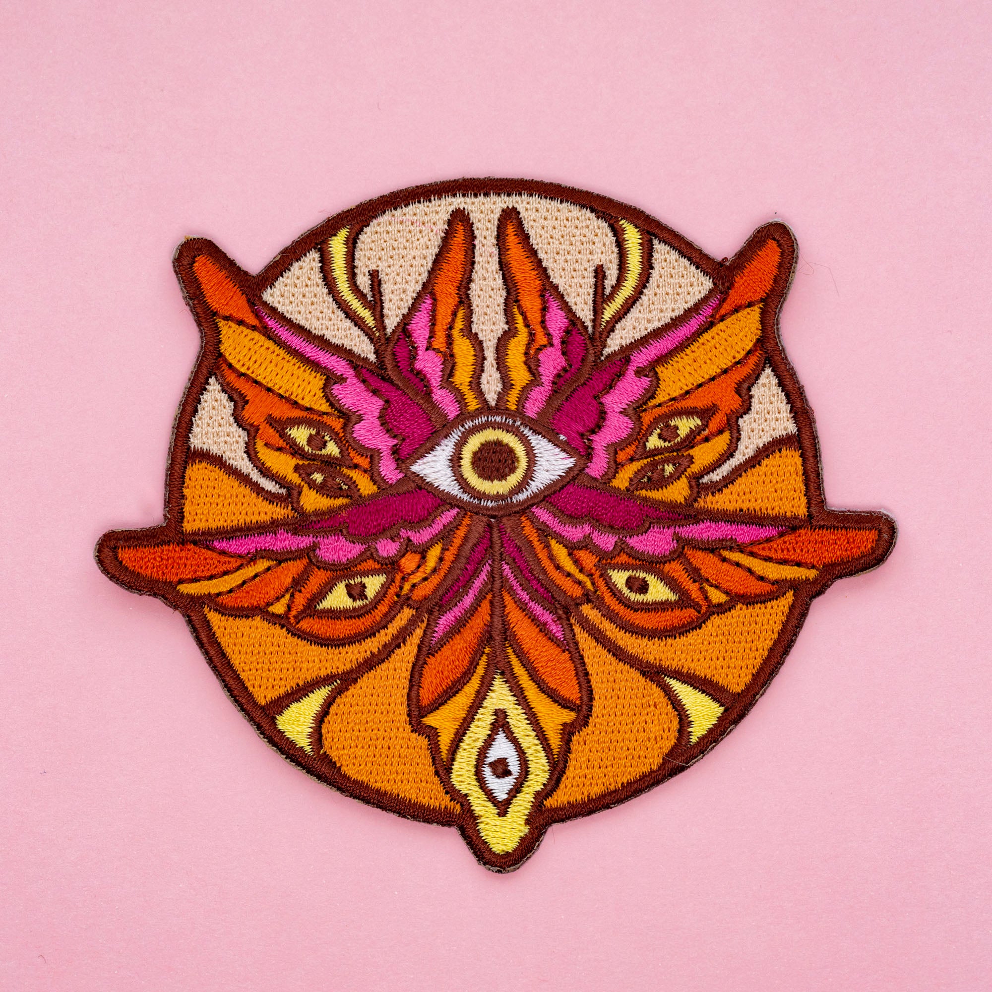 A butterfly-like seraph, for Lesbian pride.The patch is 4 inches (10 cm) on the longest side, embroidered with an iron-on backing. The backing should last for 25 washes. I recommend putting a few stitches in so you don’t lose the patch.