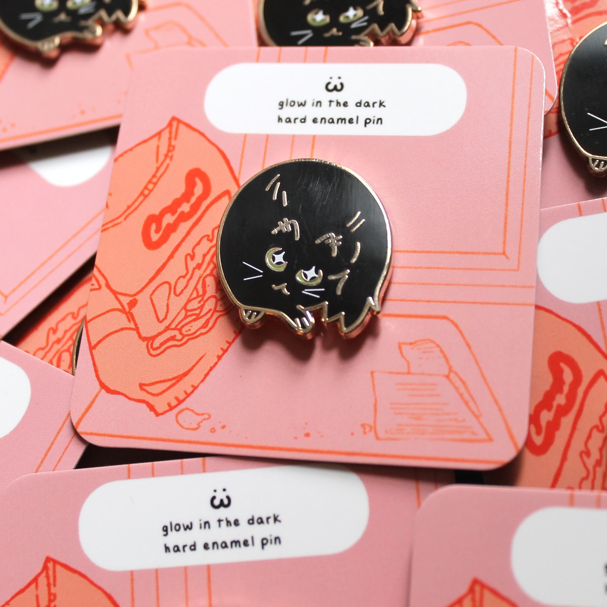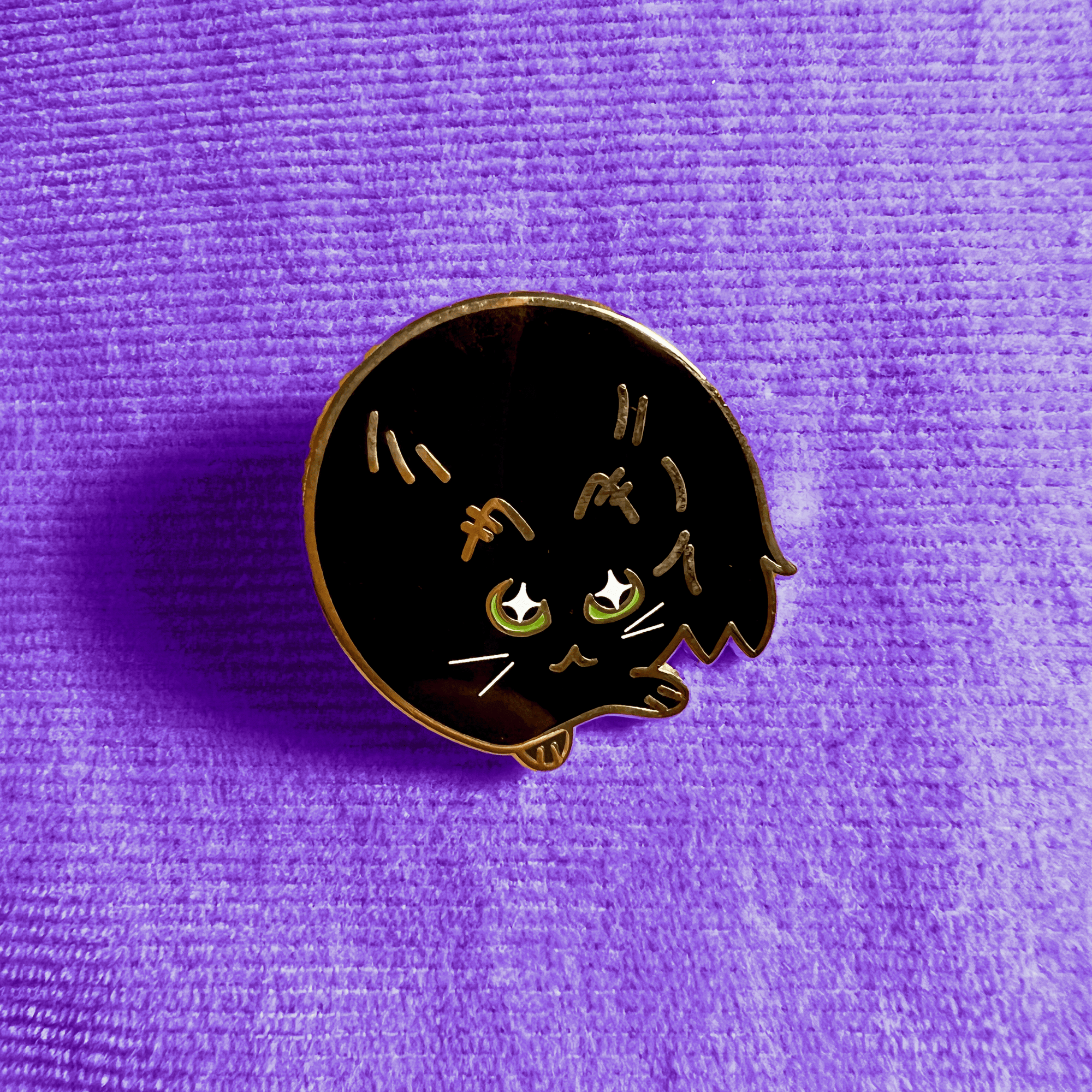Just look at that little cat! They've never done anything wrong in their life. Not once. These 1.25" pins feature two stud backings and glow in the dark eyes (all the better to watch you get a midnight snack with).