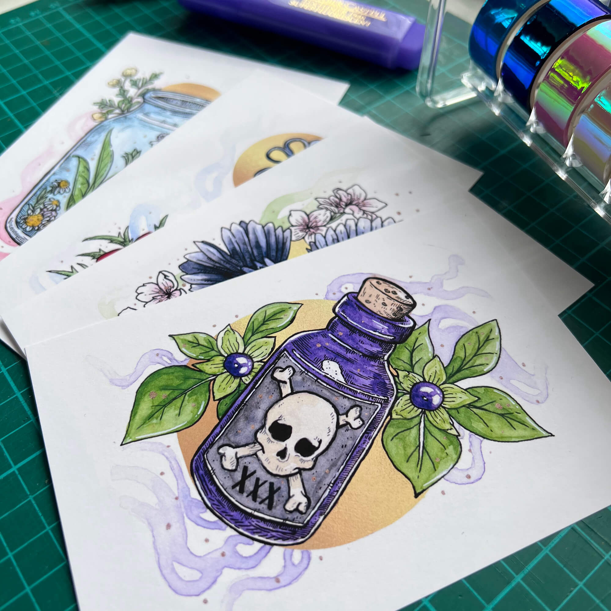 This mini-print 4x set depicts magic-inspired artifacts and familiars on colourful smoke backgrounds. Printed with vibrant pigmented ink on matte photo paper, this print set absolutely pops with colour!