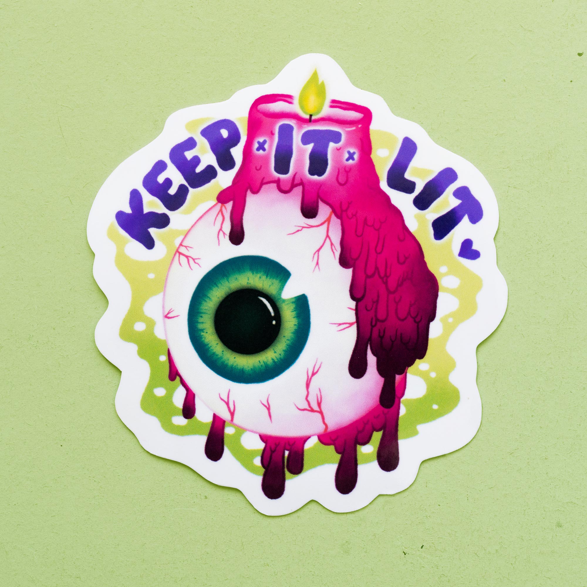 Remind yourself to Keep It Lit with this creepy cute eyeball candle sticker. This glossy sticker is UV resistant, and designed for long-wear indoor or outdoor use.