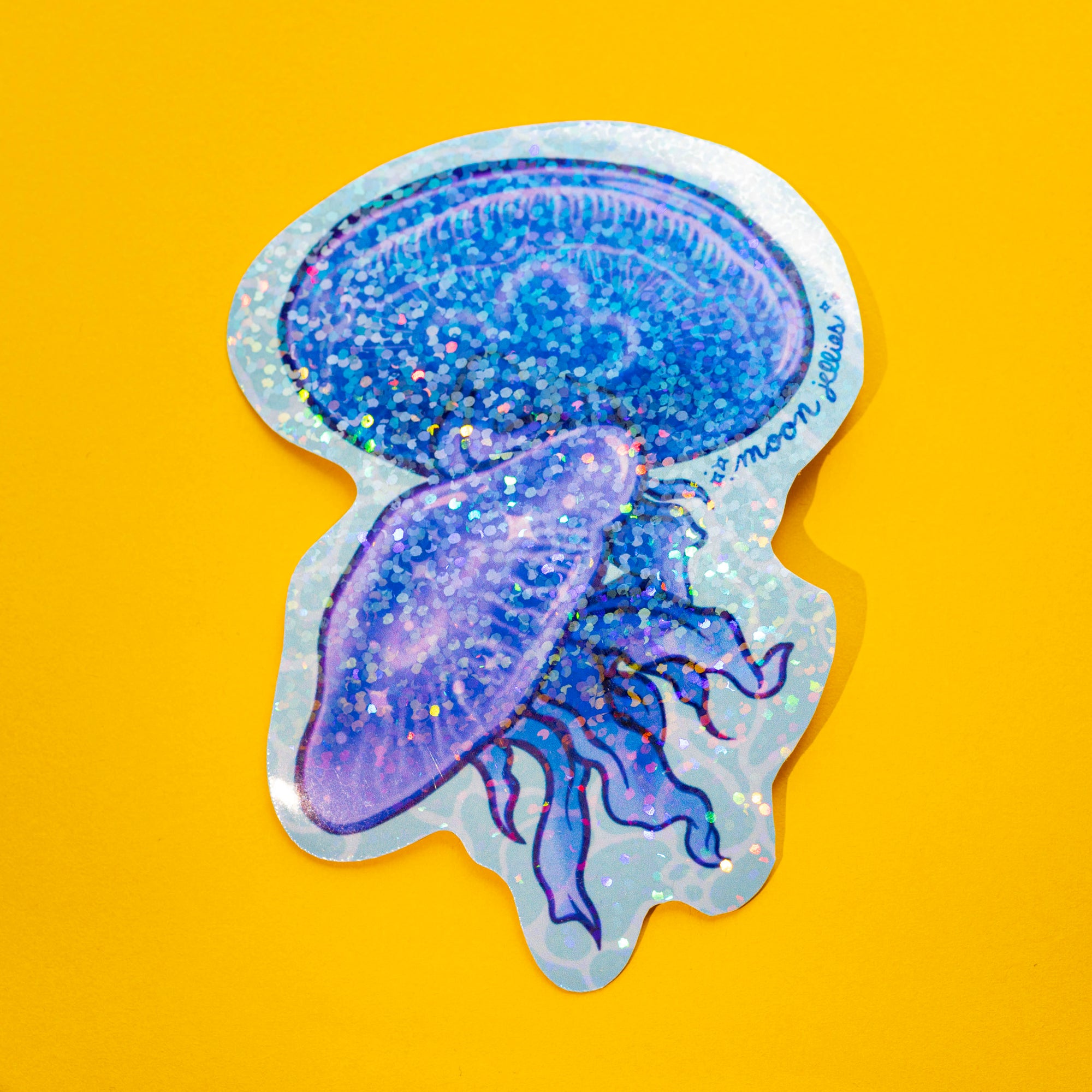 Chances are, you've maybe spotted these beautiful Moon Jellyfish floating in the sea, they're one of the most common and magical jellyfish around. This sparkling sticker has vibrant colours and a rainbow shimmer for maximum cosmic vibes.