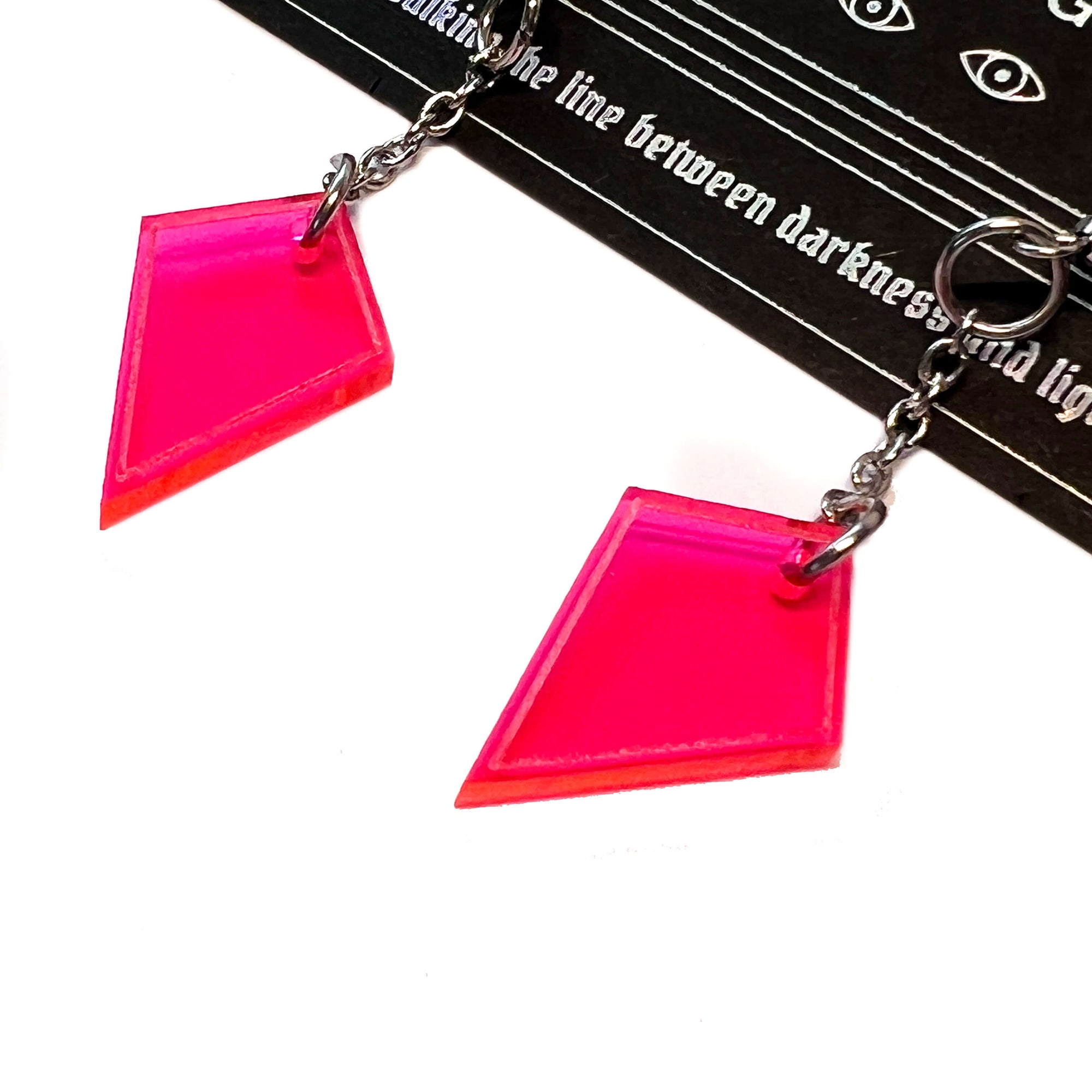 This neon acrylic has become a mainstay of my designs because I absolutely love how bright and magical it is. These hand-crafted chain diamonds feature delicate laser-etched detailing and an edgy vibe. Smaller than the similar Chain Arrows for those who prefer a shorter hang length.