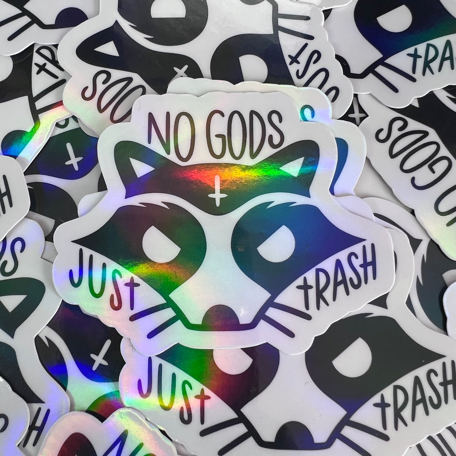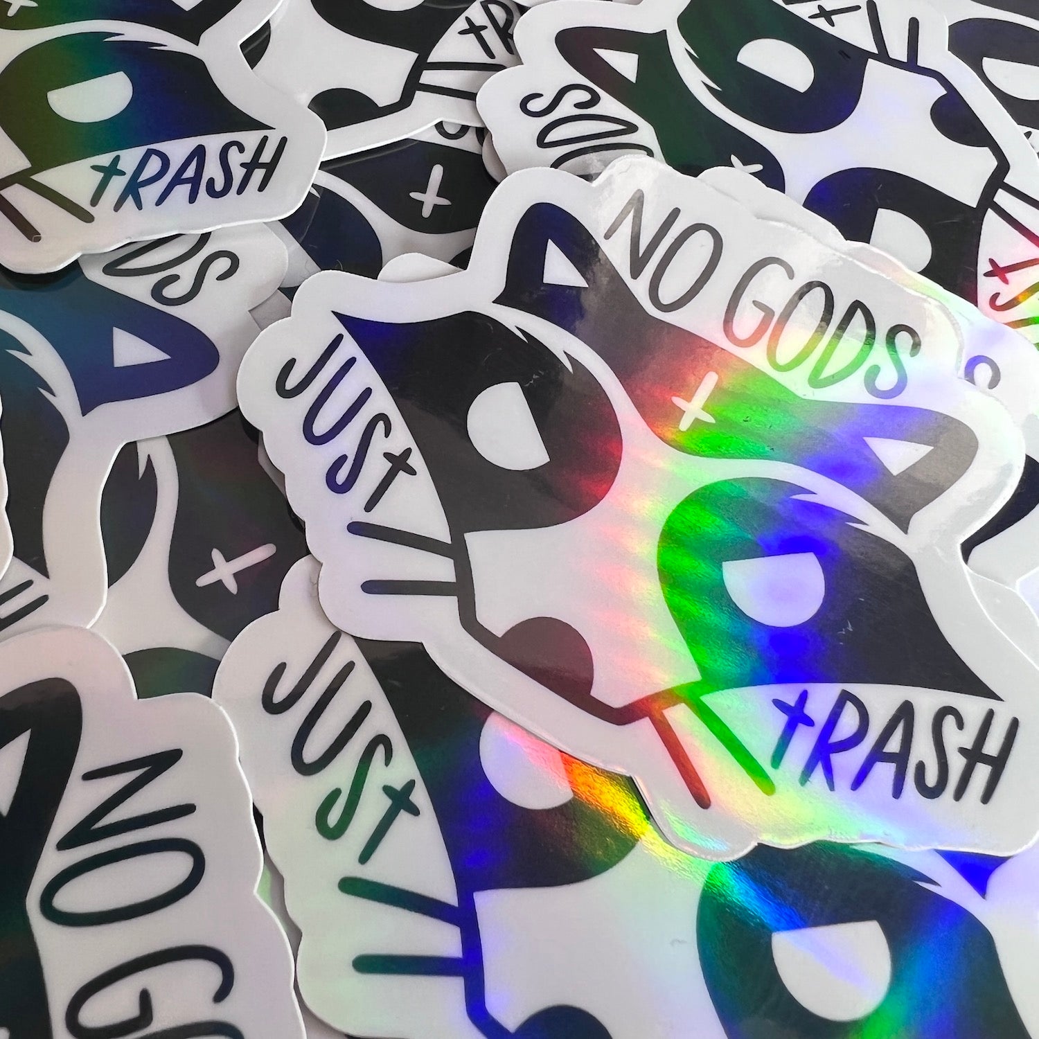 No Gods, Just Trash...This sticker is a holographic friend, that will last for ages wherever you stick it. Shimmers with a rainbow vibe that's not over the top, but definitely unmissable.