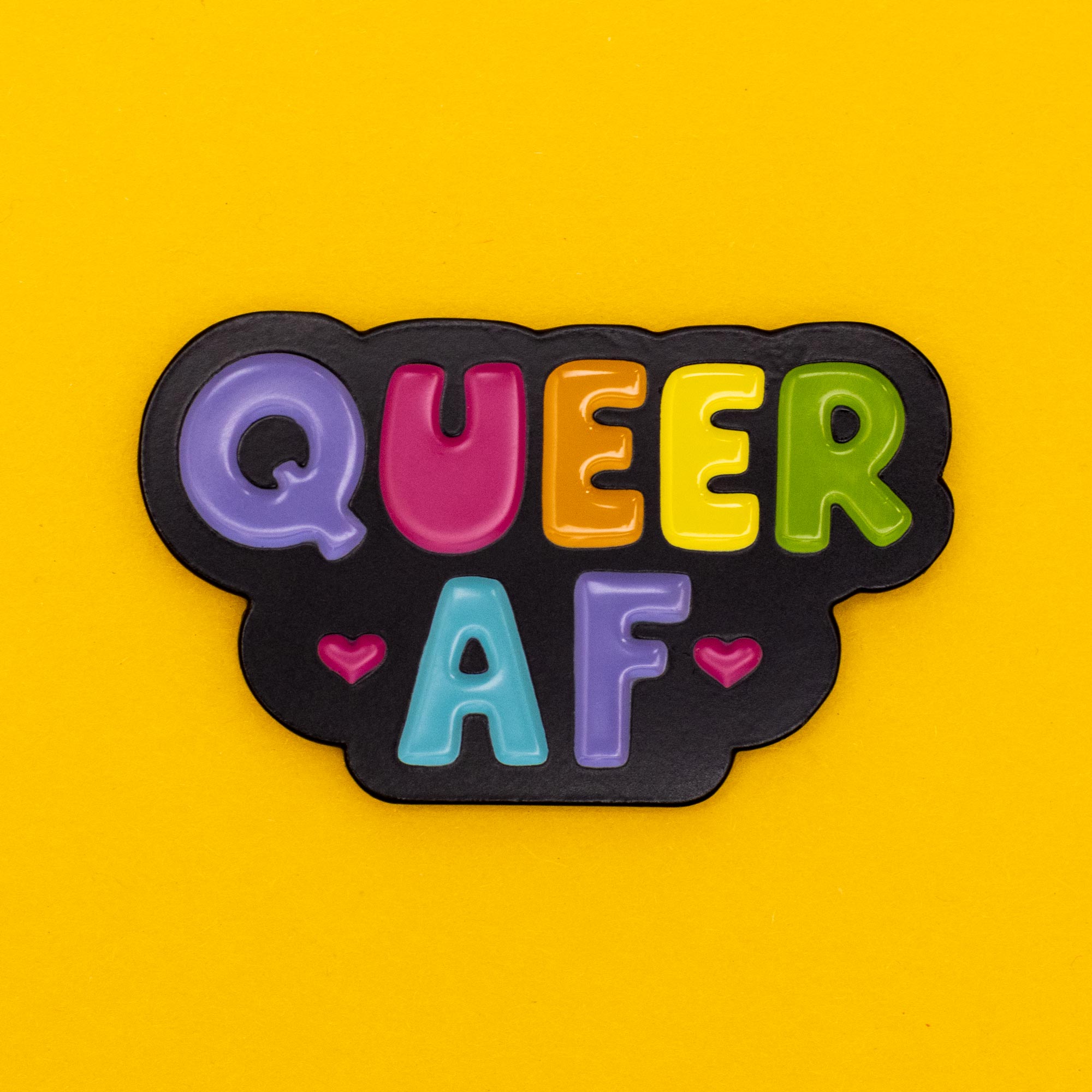 Celebrate your queer identity with this matte black and rainbow enamel pin. Featuring the perkiest lettering you've ever damn seen, this cutie will keep you feeling upbeat and make any outfit brighter