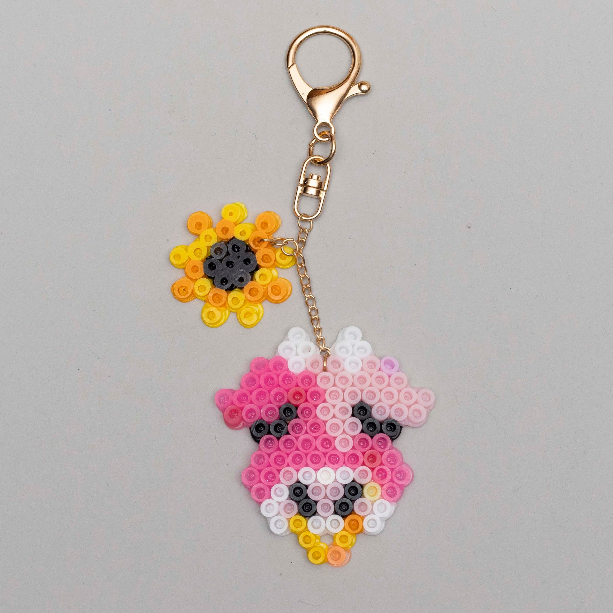 A cute lightweight keychain showcasing a sweet pink cow and matching small sunflower in pixel style.