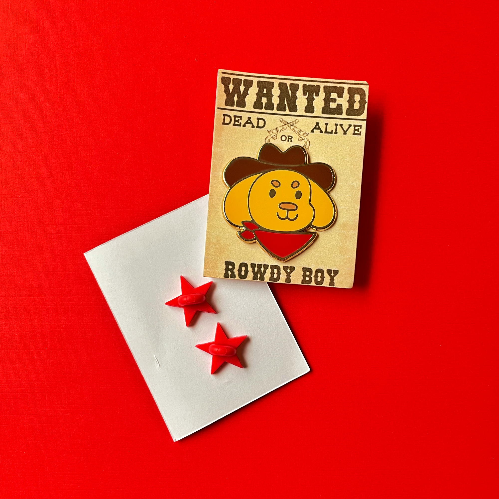 WANTED: One lil' doggy who's been up to no good! This rowdy boy enamel pin features a devilish dog, with two star backings, and our name PupLion engraved onto the back! It's gold plated and hard enamel filled. Perfect for showing off your cowboy flair.