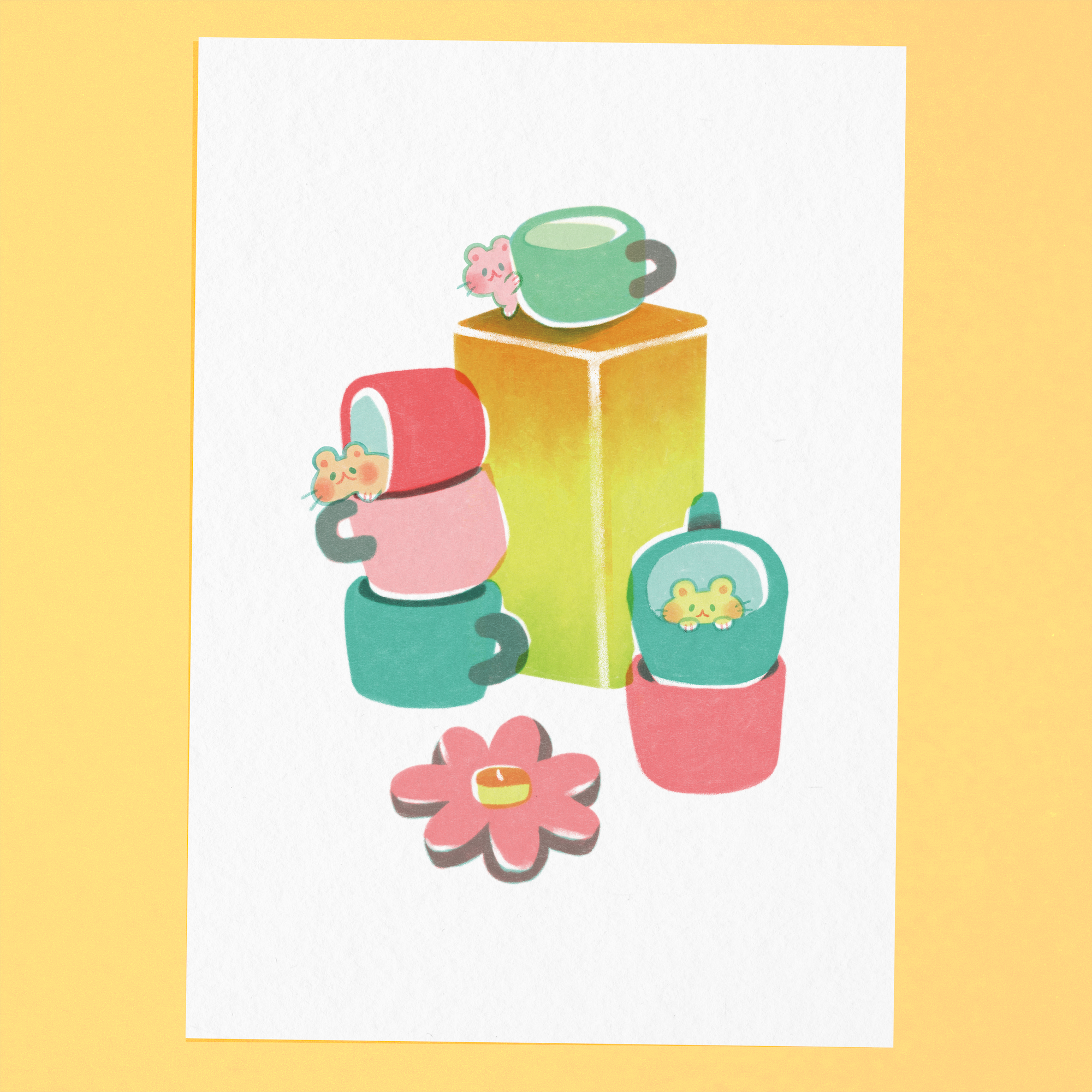 Nothing says fine art like a study of mugs and litte hamsters, now as an A4-sized print!
