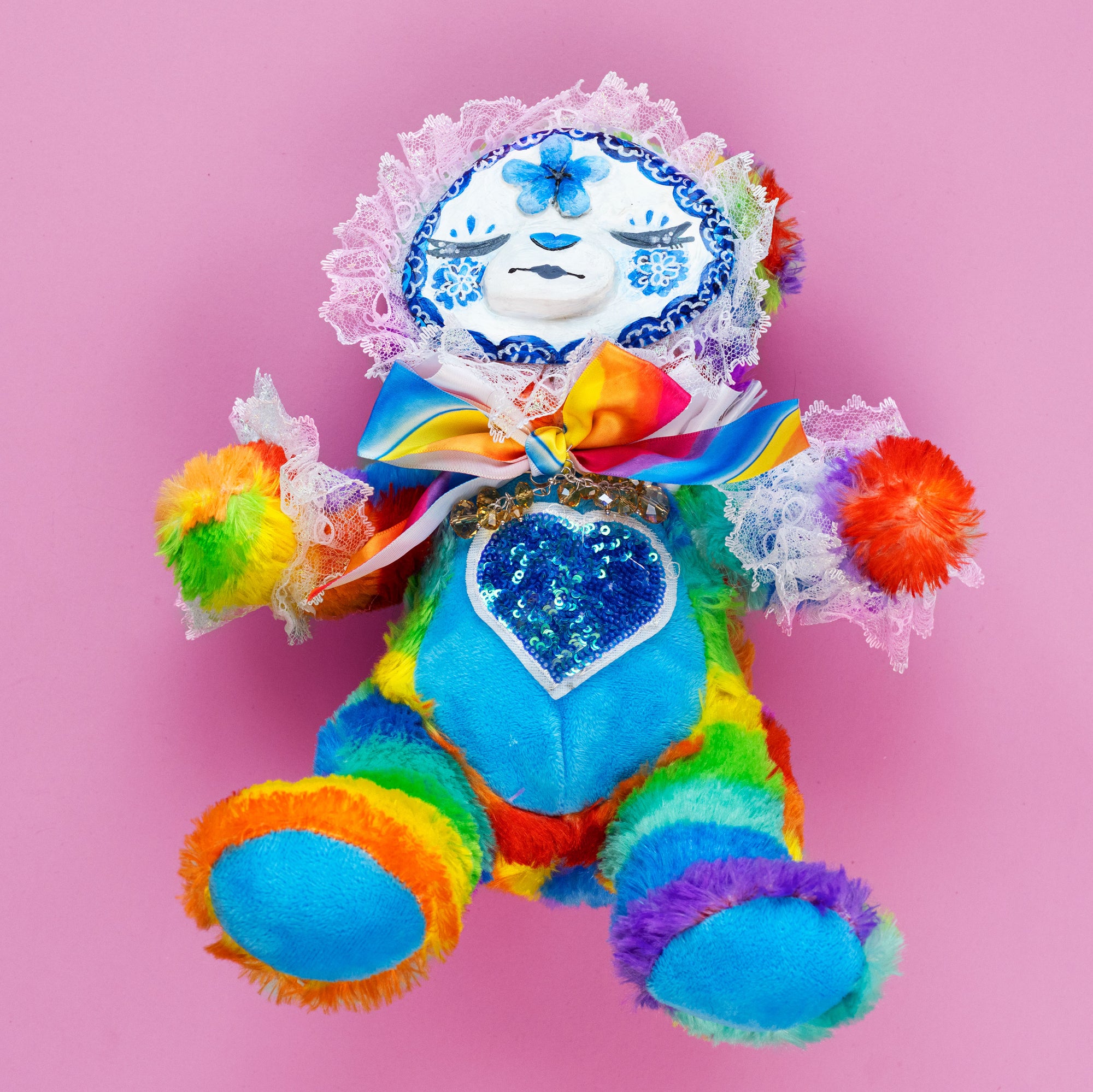 This friend may look posh with her porcelain-esque face, crystal jewelrry and lacy trim, but they can't help the way their colorful personality show up in their fur! A sweet friend, who would be at home at a fancy tea party or a rainbow rave. More information on their make and care can be found here
