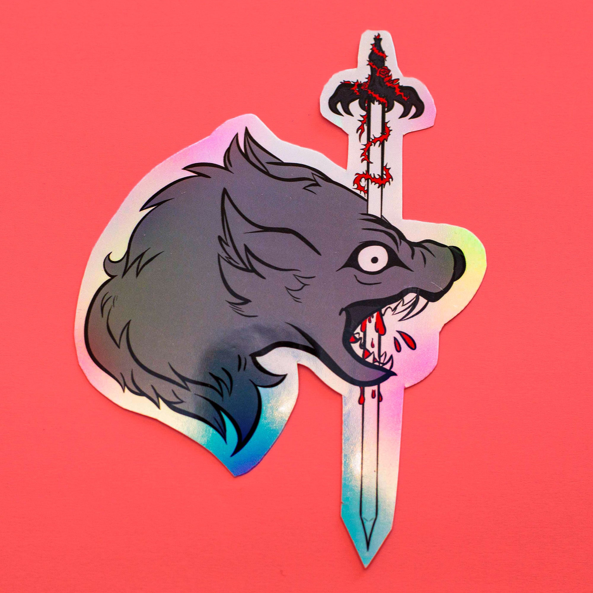 Holographic vinyl stickers featuring a wolf's head impaled on a sword.
