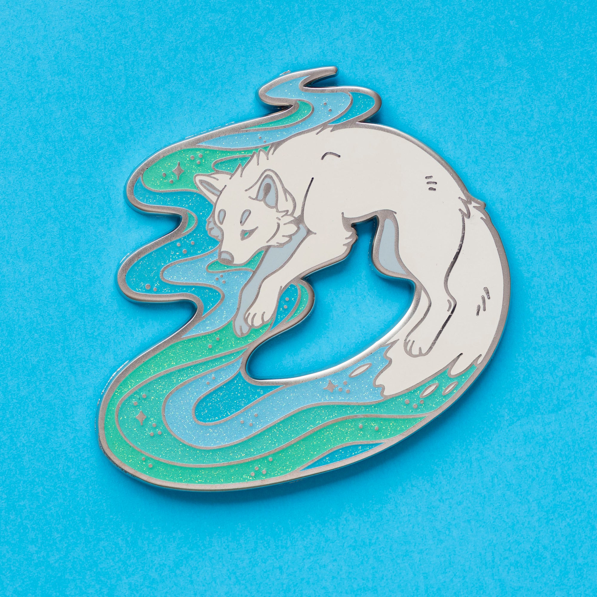 Beautiful glitter aurora arctic fox pin. Recommended for display only.