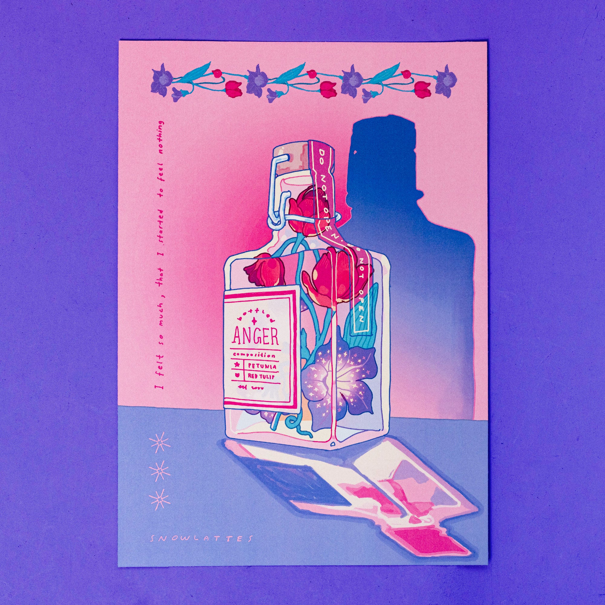 Bottling up feelings of anger, grief and resentment. Are you feeling it too?Featuring the Bottled Emotions Print series, illustrated by Snowlattes. 3 Illustrations depicting negative emotions through a variety of flowers for the composition of each Bottled Emotion. Bottled Anger consisting of Petunia and Red Tulip, Bottled Resentment consisting of Tansy, Lavender and Basil, and last of all, the Bottled Grief consisting of Marigold and Lily of the Valley.