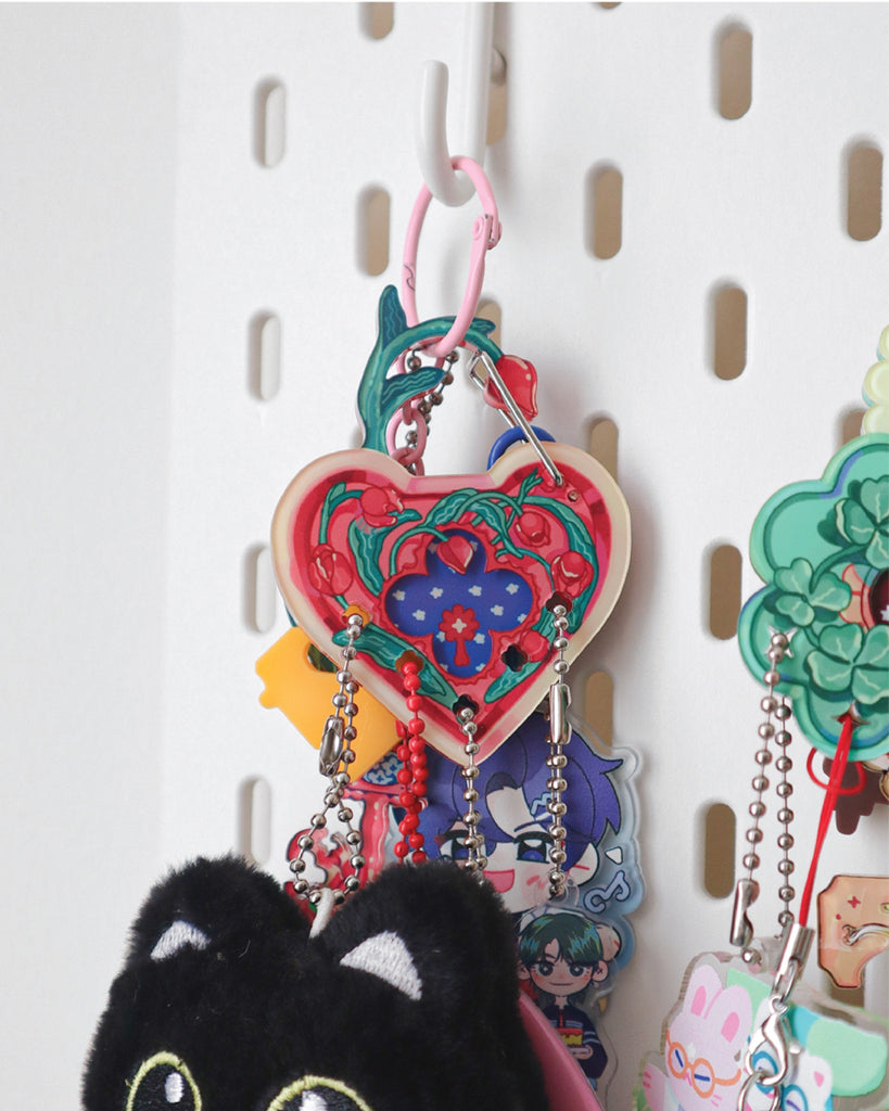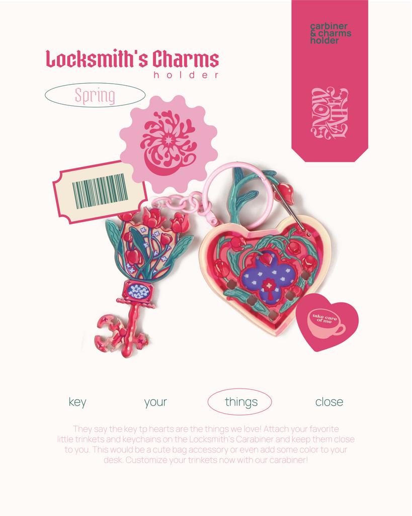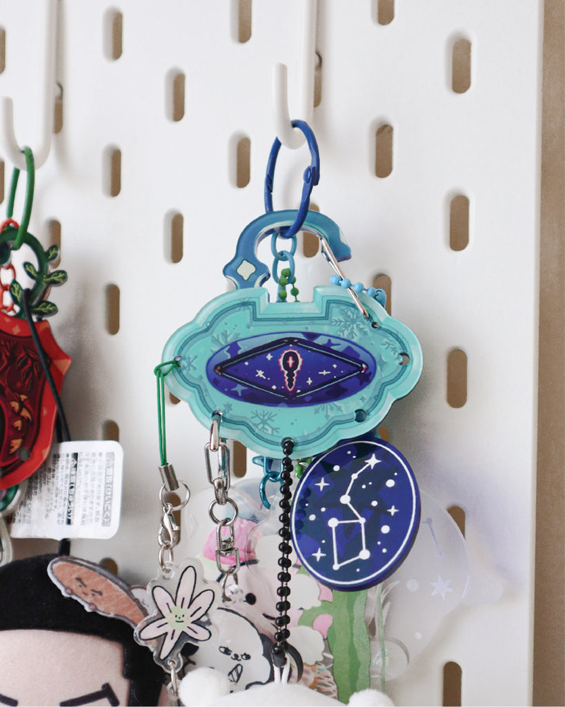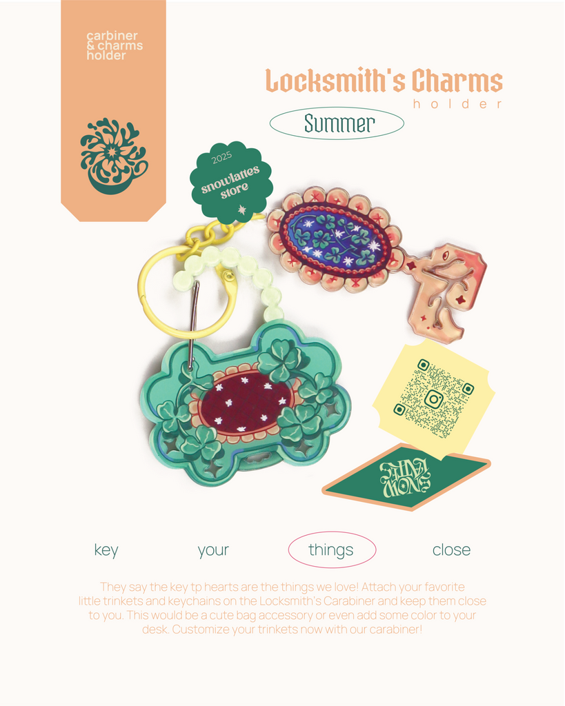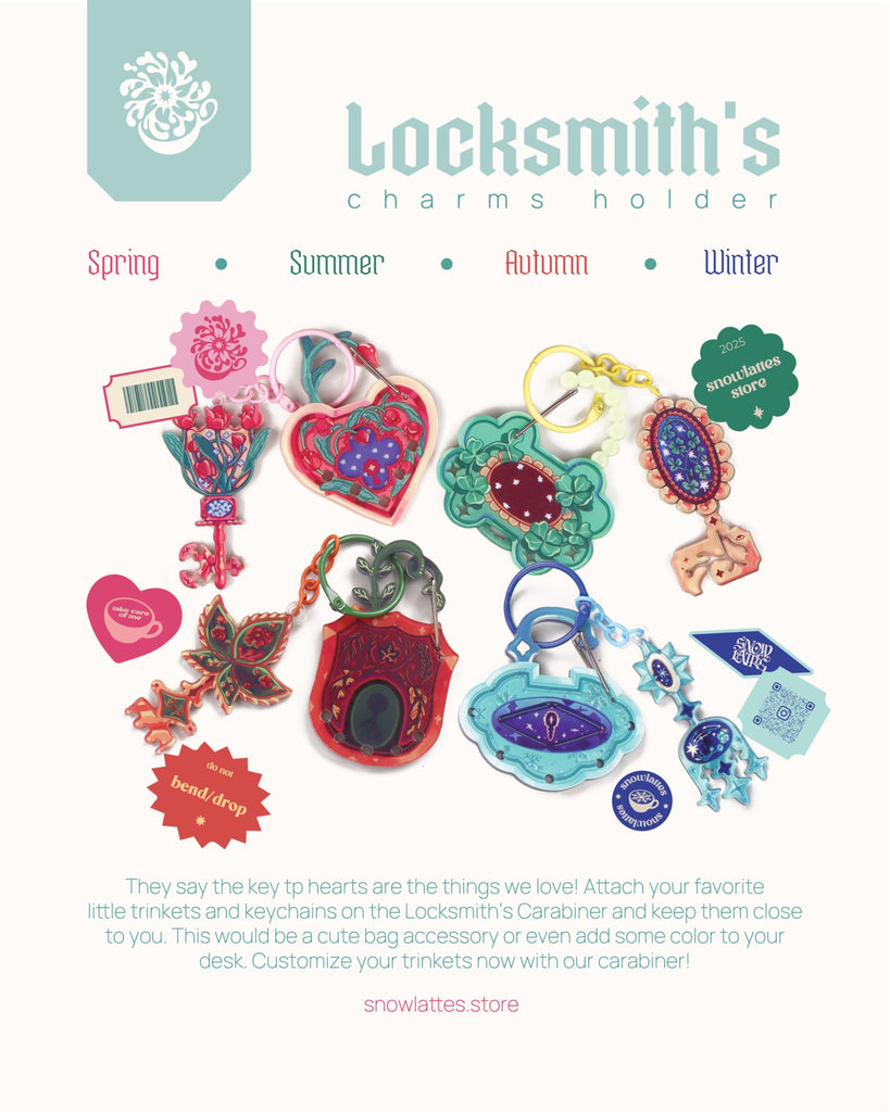 The Locksmith’s Charm Holder  is available in 4 colors and is around 6-7 cm in size. The material is made of acrylic. It can hold mostly smaller clasps or phone charms with straps. The carabiner itself has 3-5 holes that vary from design to design. We recommend not to put too much items as it is a decorative carabiner.