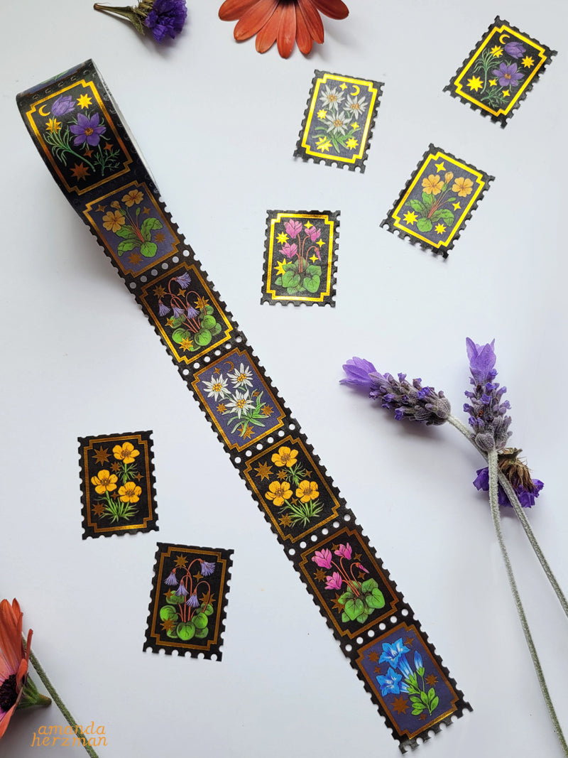 Featuring plants that are happy in high, alpine meadows and craggy mountain sides, alpine plants are small, surprising treasures for the adventurous mountaineer. This gold foil stamp tape features cyclamen, edelweiss, pasque flower, alpine buttercup, moonwort, gentian and primrose. The washi is 2.5cm, on a 5 metre roll.
