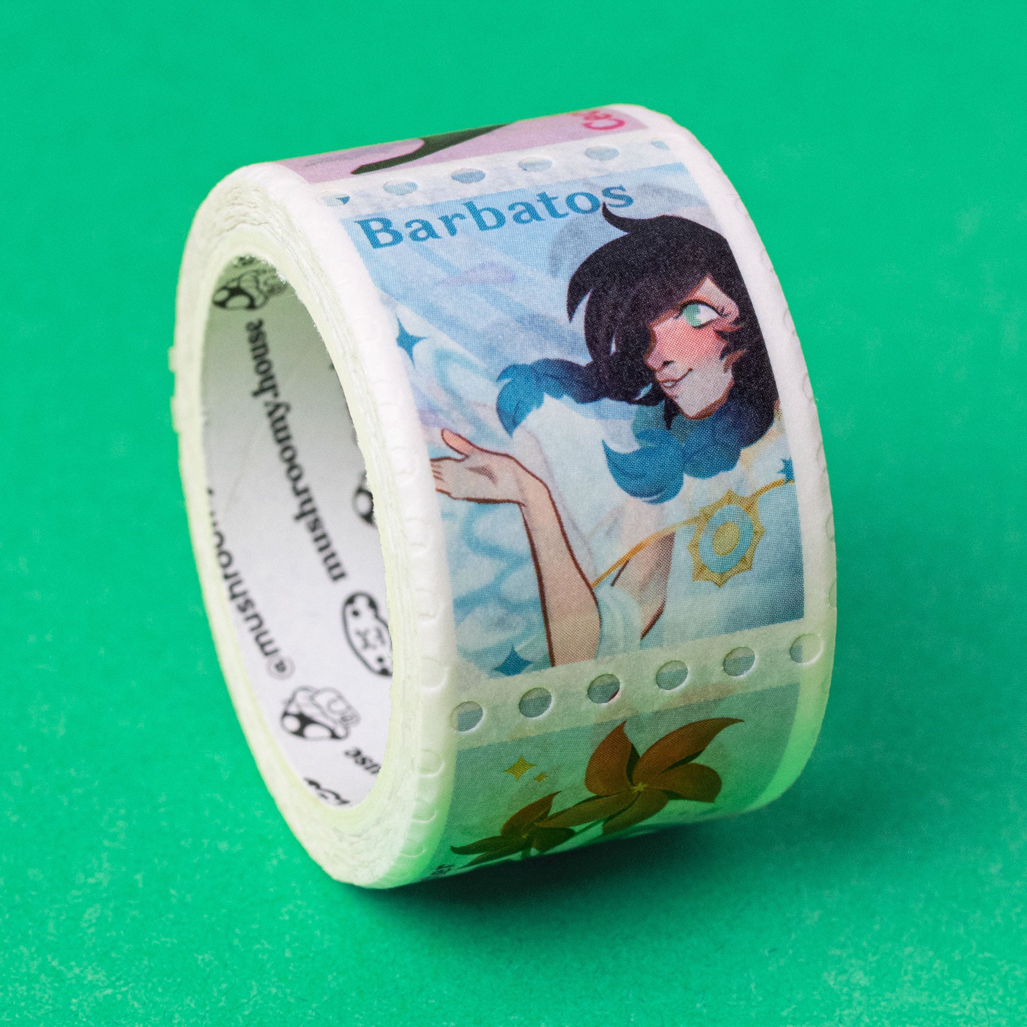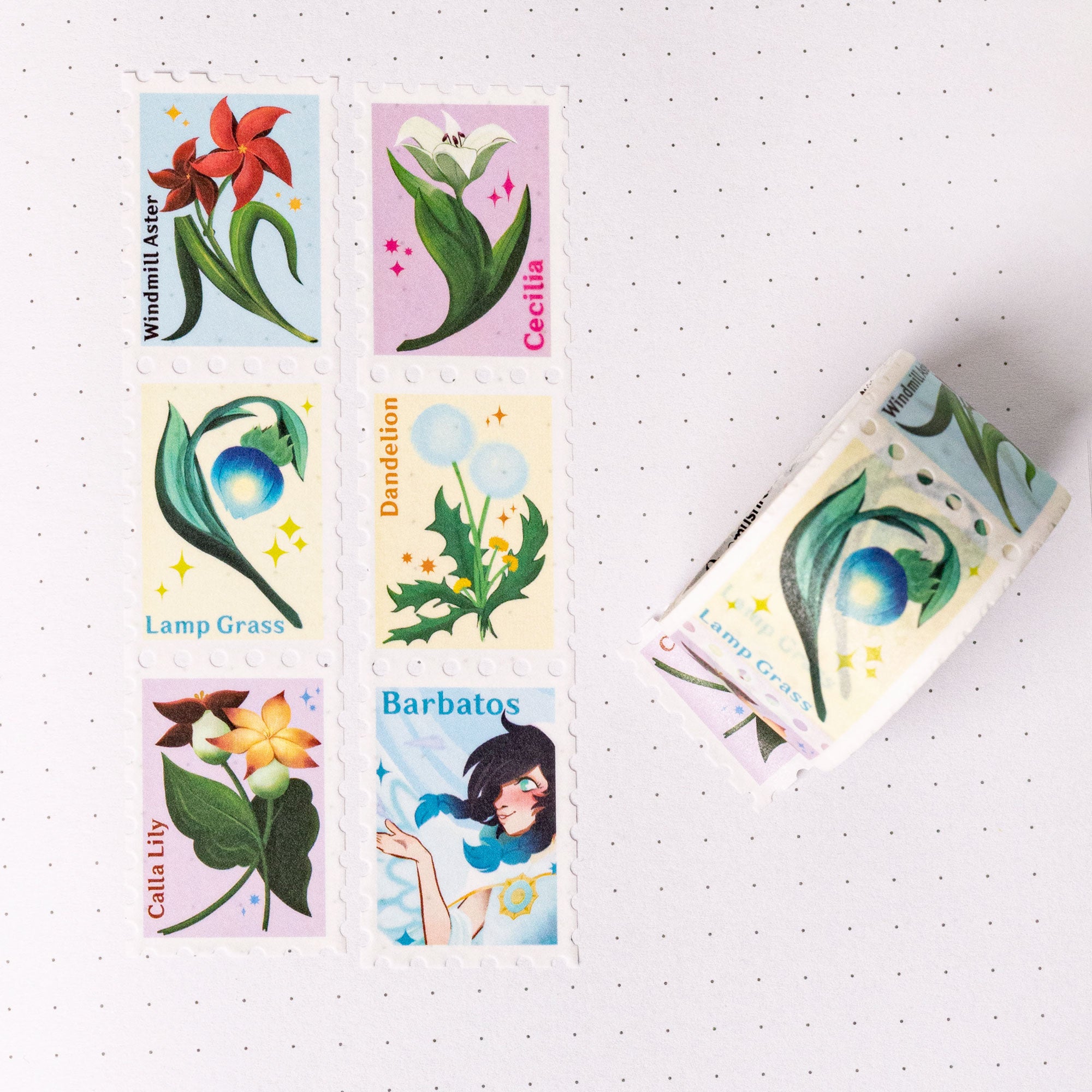 Genshin Impact themed stamp washi featuring the notable plants and flowers of the mondstadt region, and of course the breezy archon Barbatos!