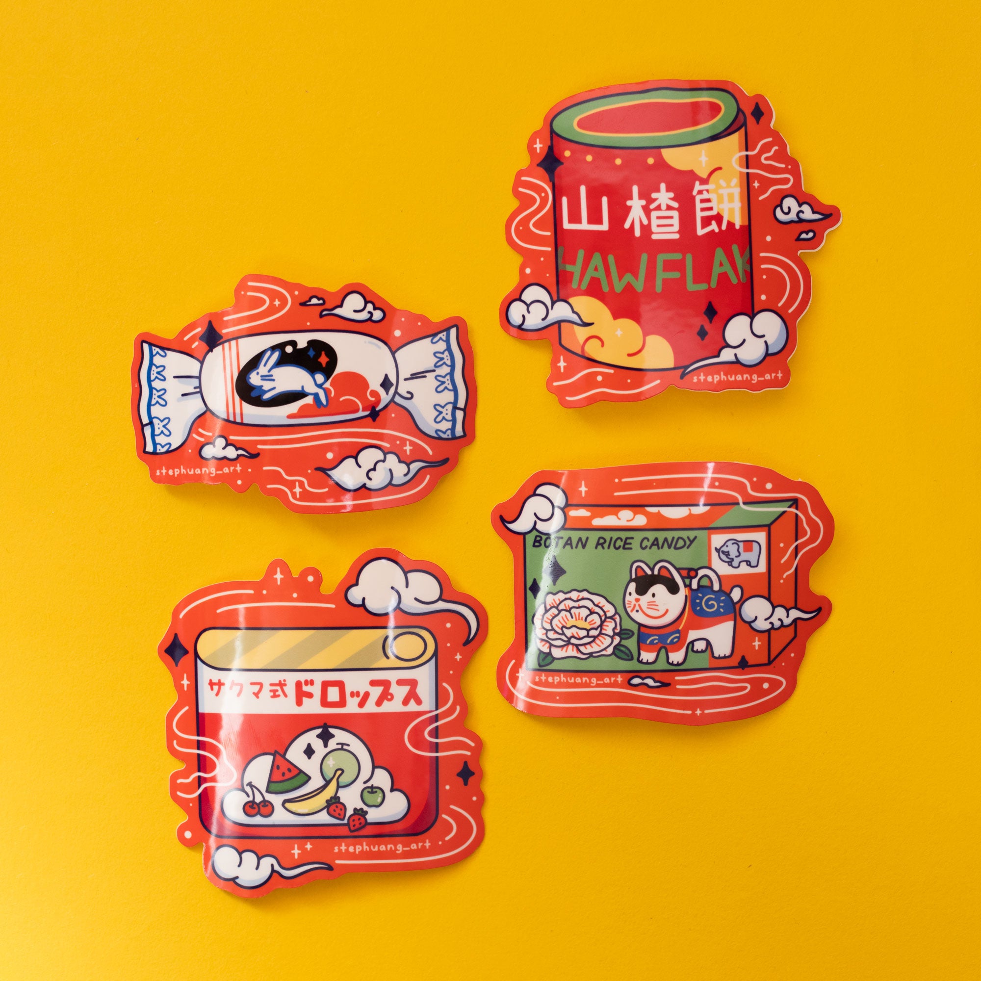 Nostalgic asian candies that you might have eaten growing up including white rabbit candy, haw flakes, sakuma drops, or botan rice candy. Choose in the dropdown which design you'd like or grab all 4 for a small discount.
