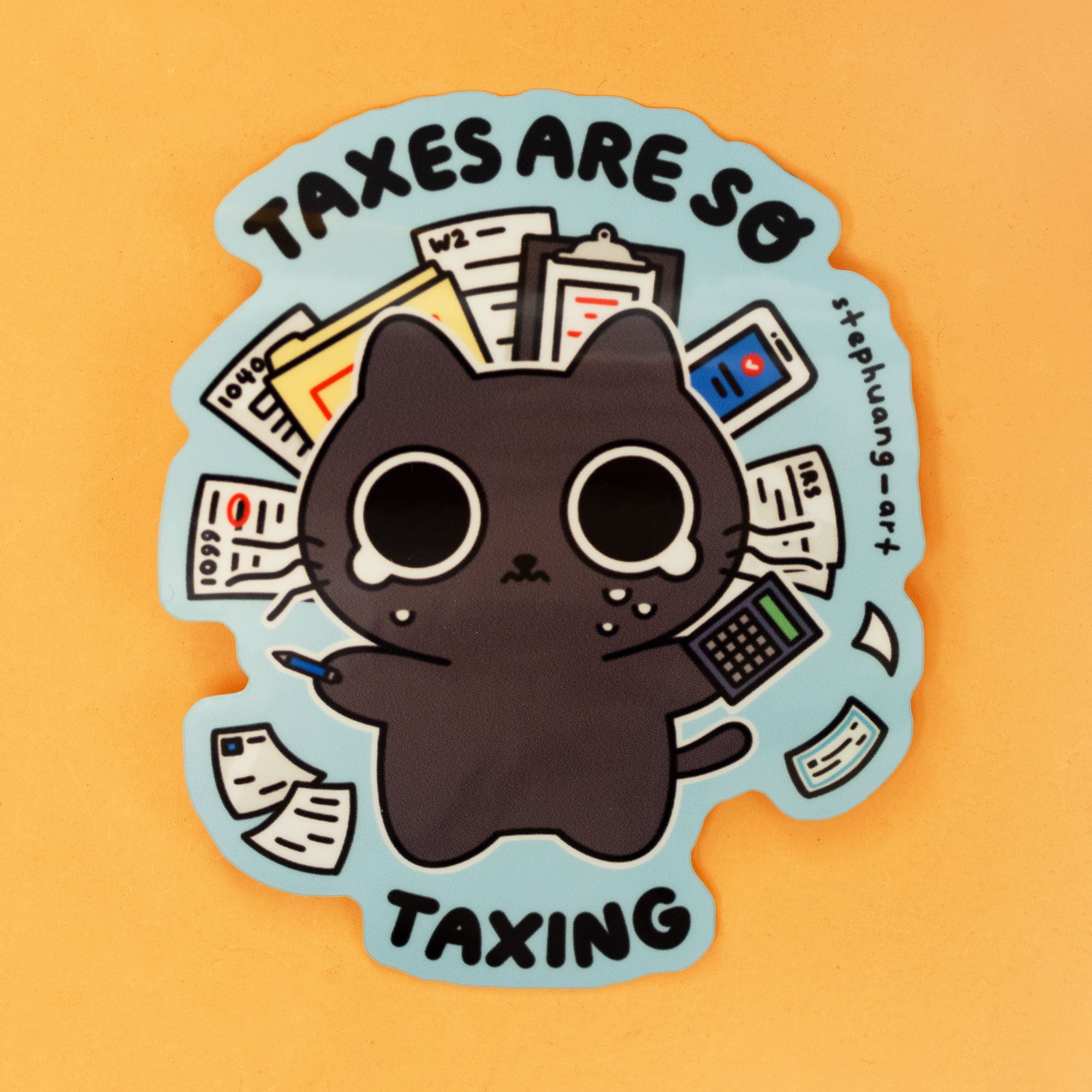A sticker featuring a black cat crying because they have to do taxes. This design came about because I found that doing taxes as a small business owner is so unnecessarily hard, and well, taxing. If you think that taxes are hard too, this sticker is for you!