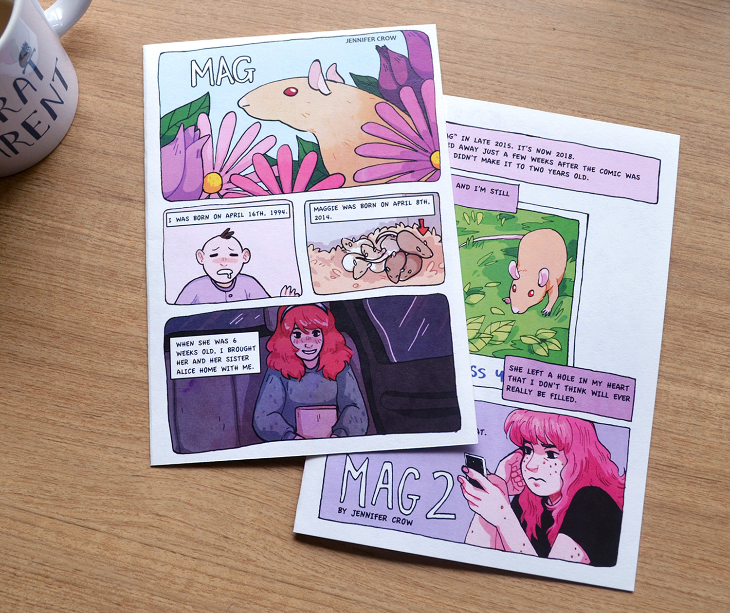Two 2-page, full-colour A5 comics about Jennifer's pet rat, Maggie, and their thoughts on her short lifespan. The follow-up story has more a more uplifting reflection on those feelings.