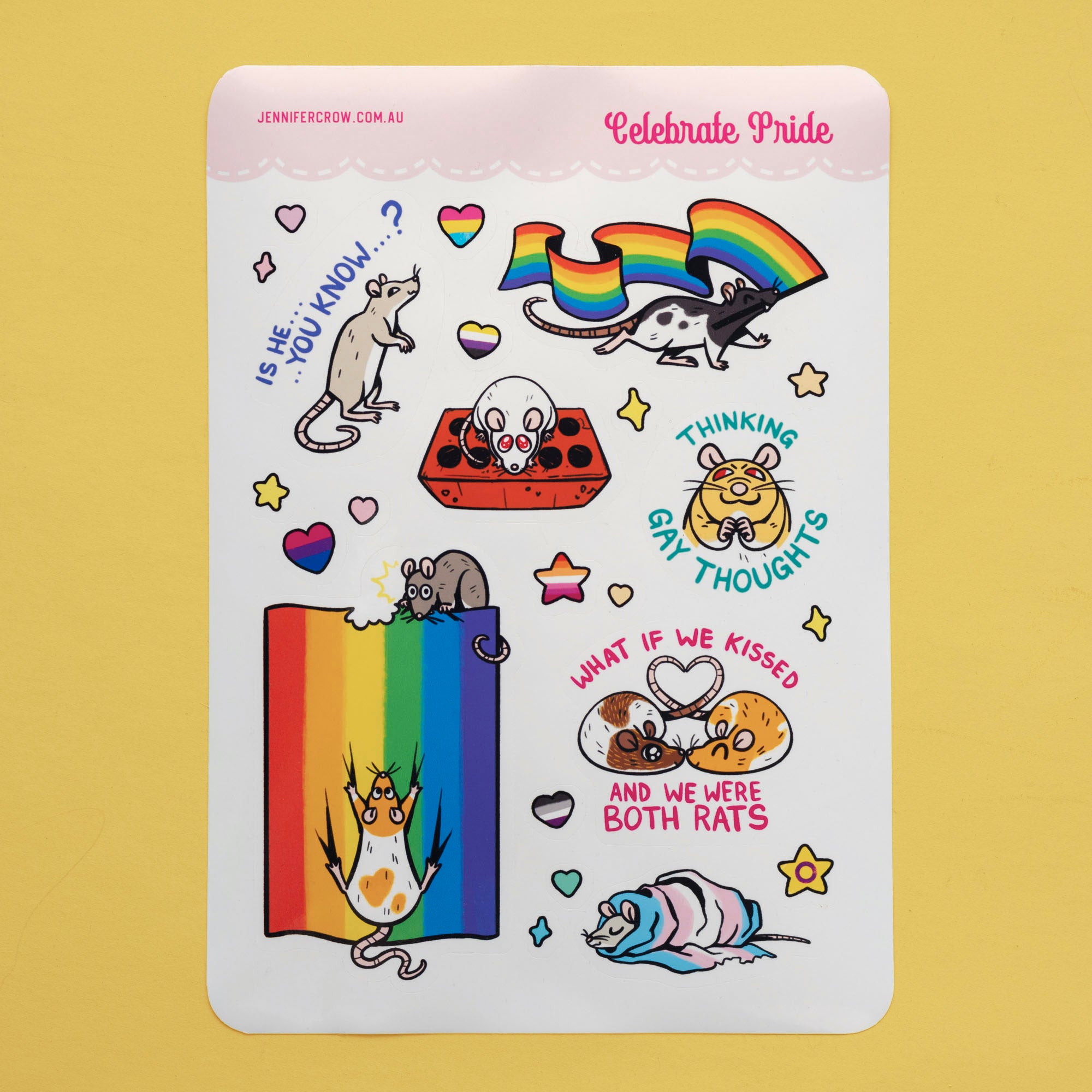 A vinyl sticker sheet, featuring crafty little rats celebrating LGBTQIA+ Pride!