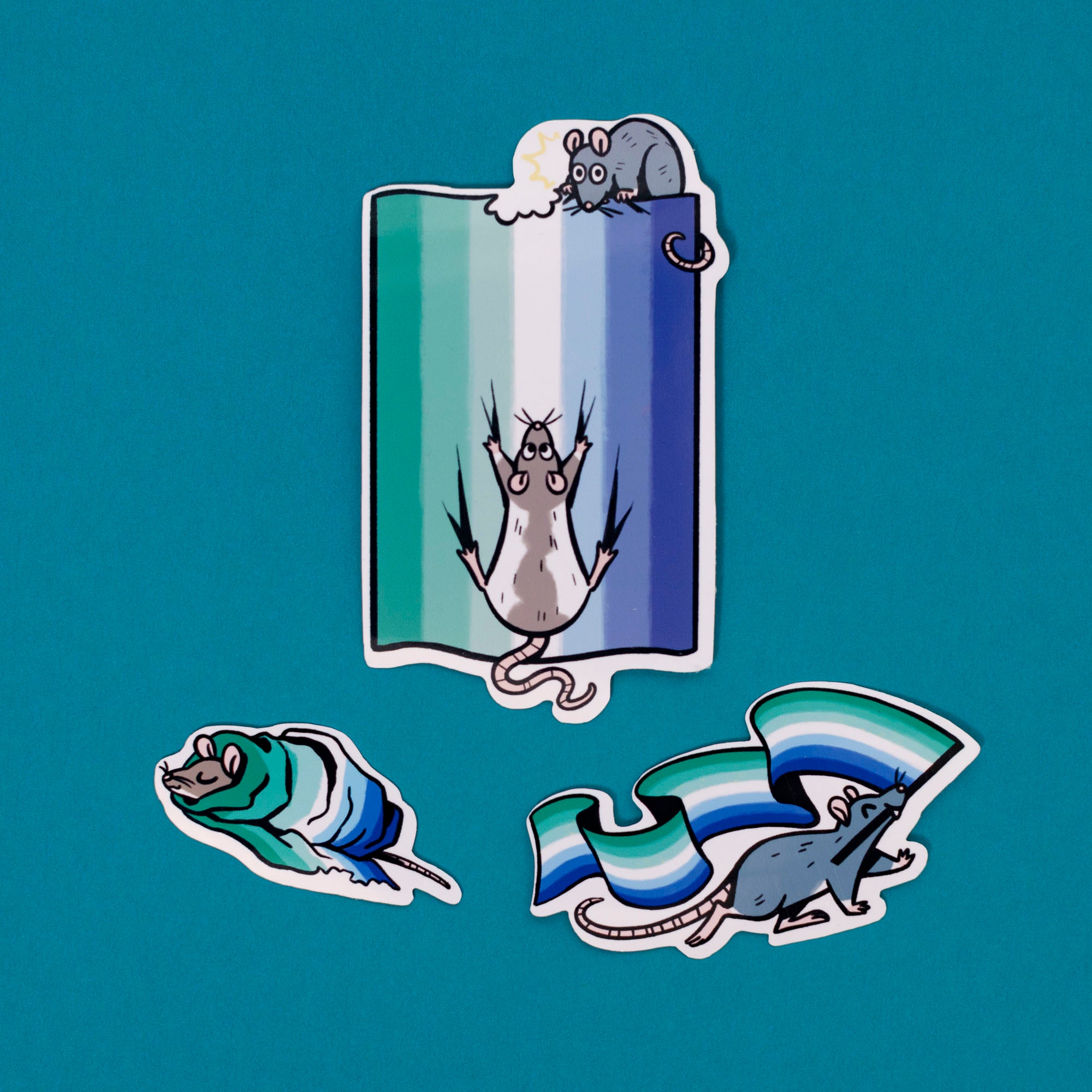 A set of three matching vinyl stickers featuring some happy little rats climbing on, carrying, and wrapped up in the LGBTQIA+ Pride flag of your choice!