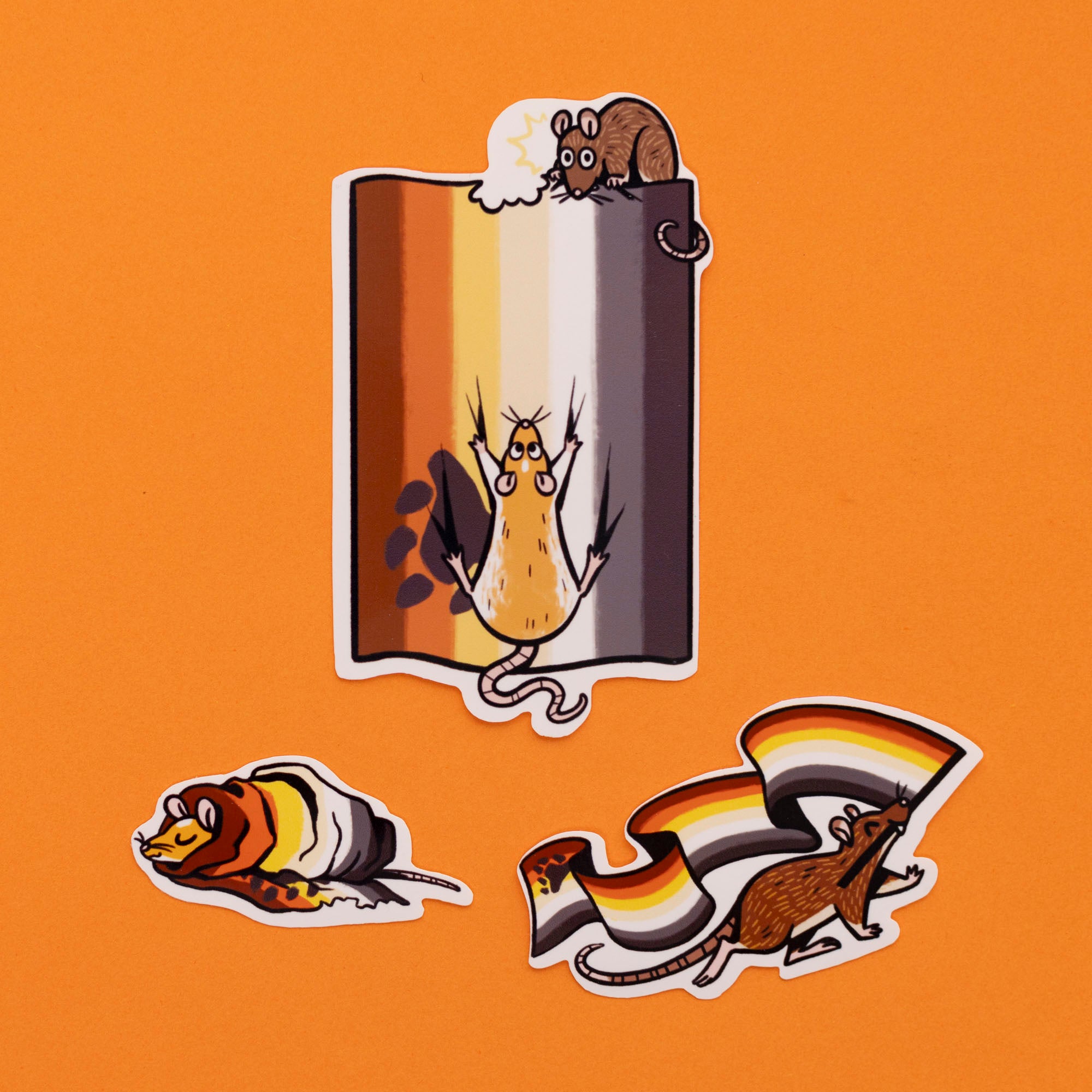 A set of three matching vinyl stickers featuring some happy little rats climbing on, carrying, and wrapped up in the LGBTQIA+ Pride flag of your choice!