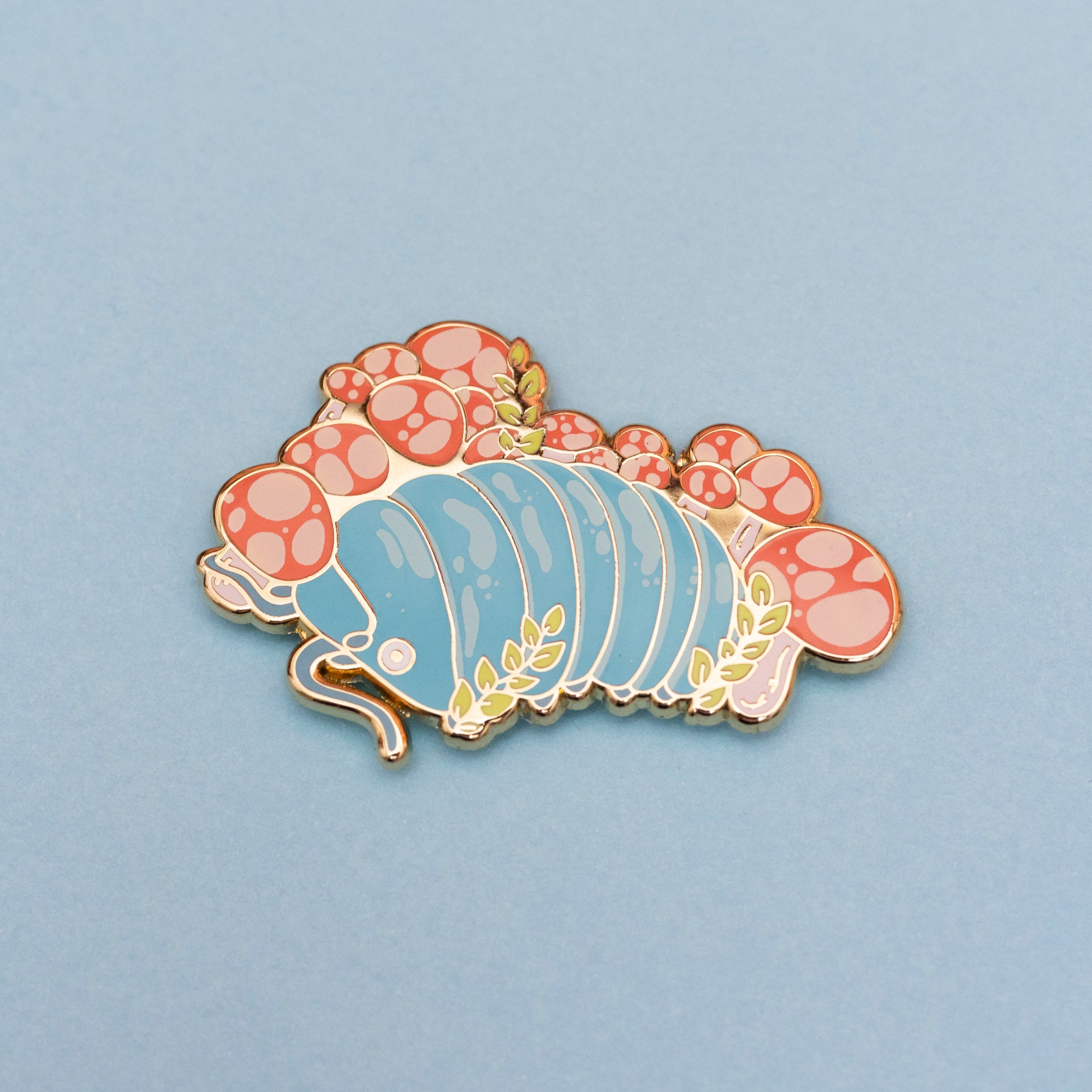 Adorn your backpack, jacket or cork board with this adorable hard enamel pin by Sugarlich, featuring a rollie mollie and their mushroom friends.