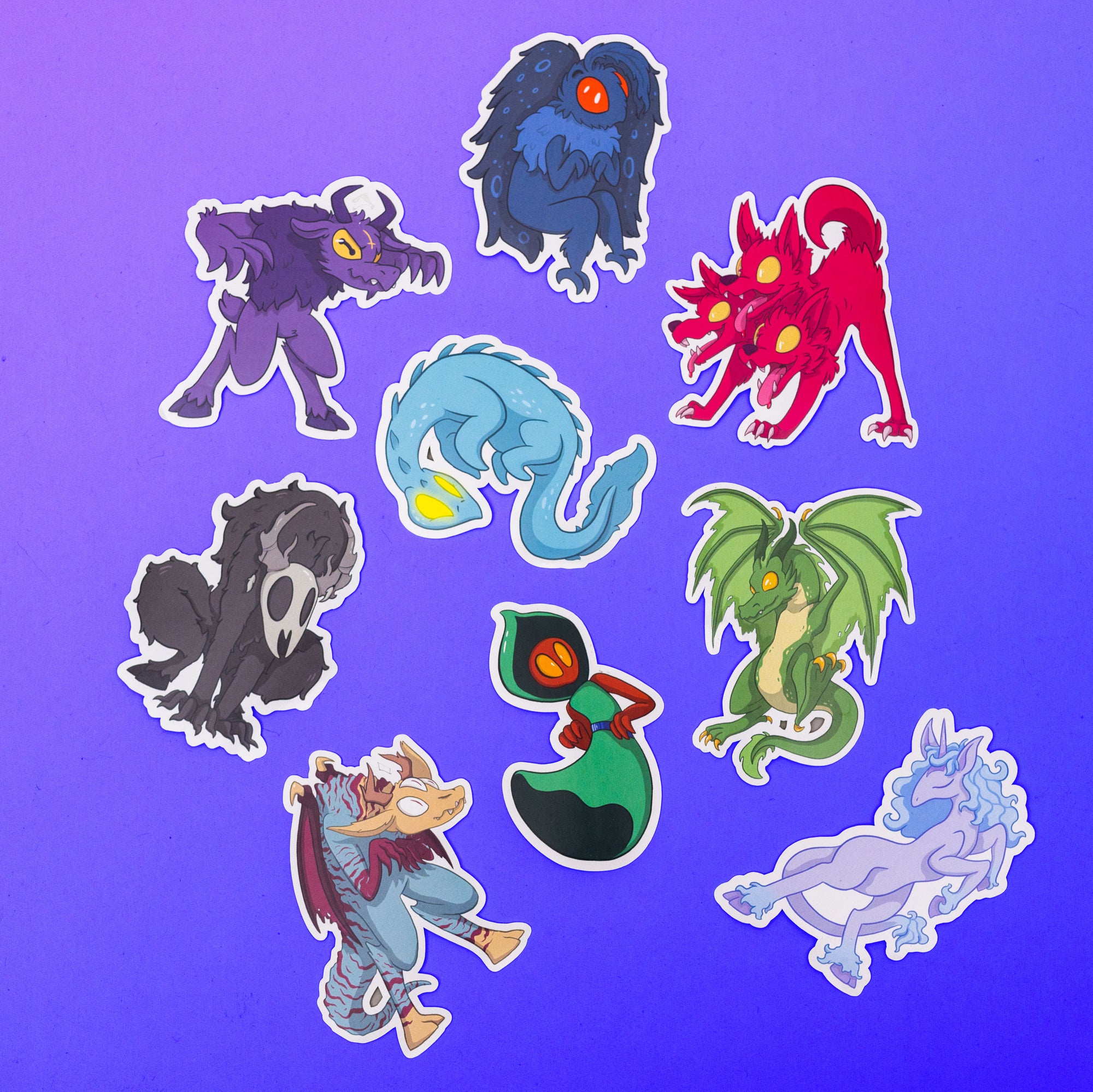 A bundle of stickers, featuring cryptids from all sorts of wellknown tales and folklaw. This set includes a total of 9 stickers.