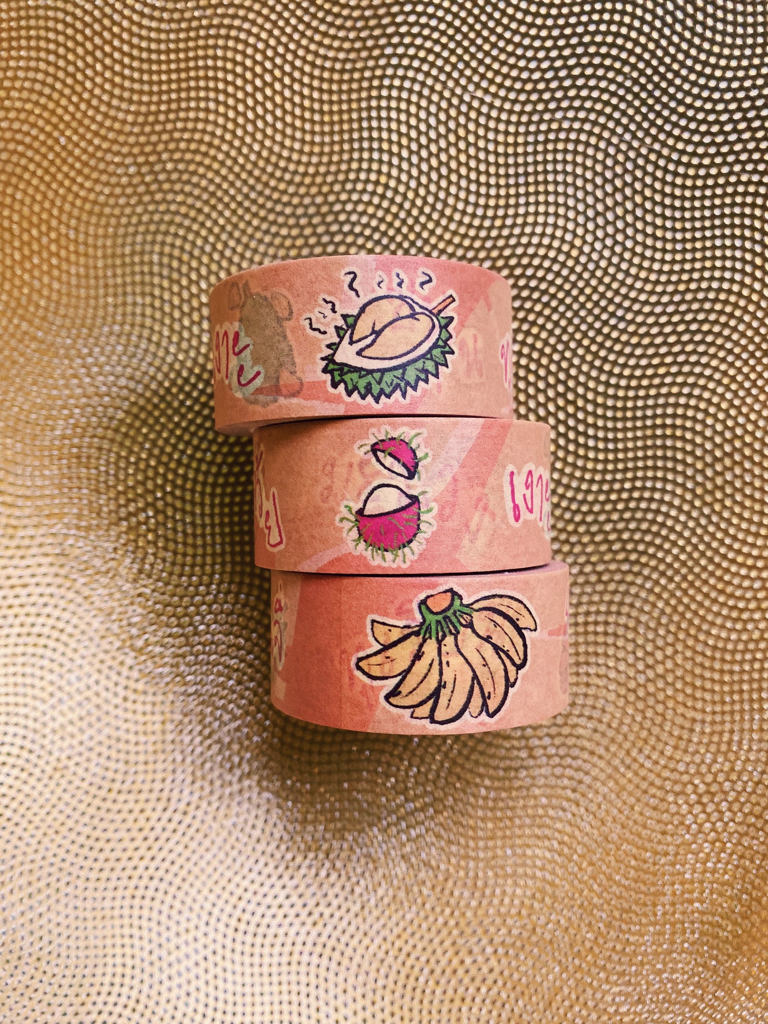 The Fruit Loot includes six iconic SEA fruits accompanied by their Thai names: Banana (gluay), Rambutan (ngaa), Durian (thuriyan), Mango (mamuang), Jackfruit (k'noon) & Lychee (linjee). The perfect market haul!