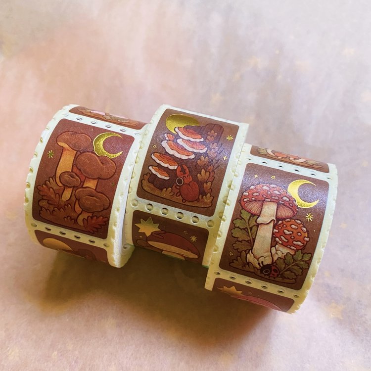 Printed paper tape with perforation for easy tear or cut guide. Features 7 unique mushroom species. Can be used individually or in a line in planners, journals, or for sealing and decorating mail. Easily peels off and leaves minimal residue on most surfaces. A perfect gift for the stationery and snail mail lover in your life - or you!