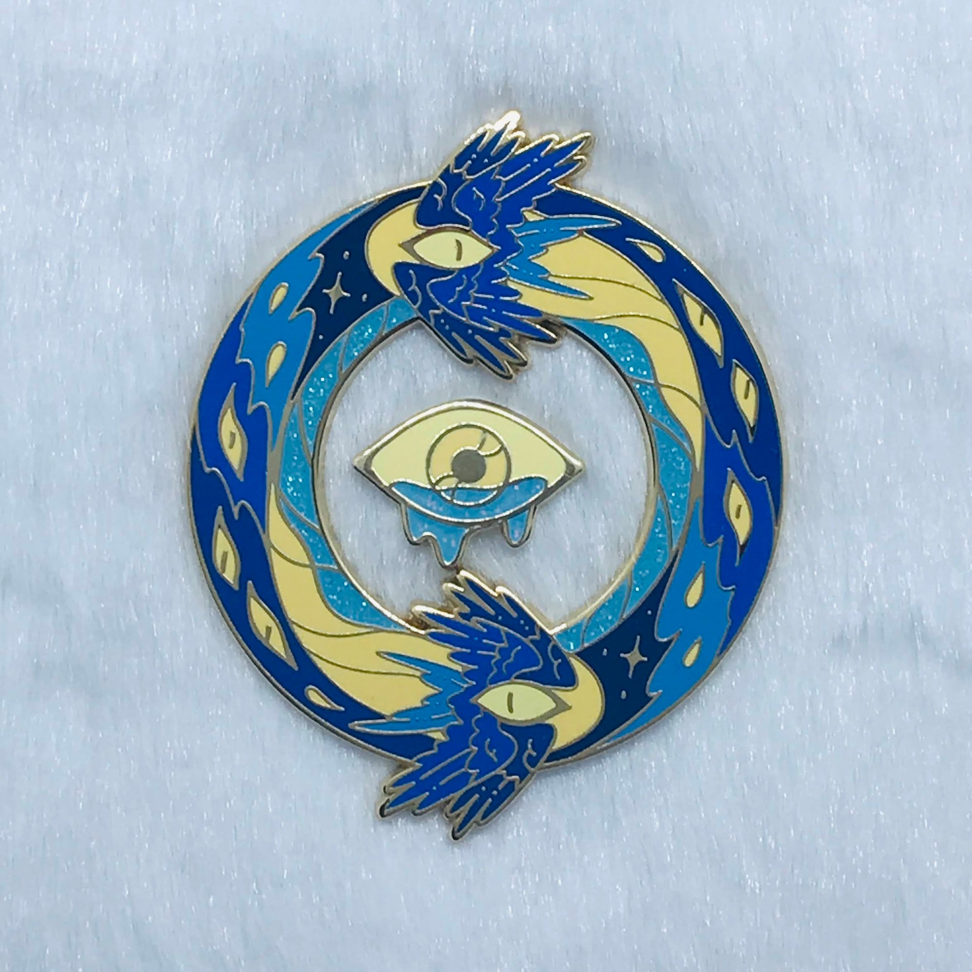 A glittering and gleaming eye, surrounded by holy seraphim. This pin consists of two parts, twin seraphim and an eye mini-pin. It features light blue glitter enamel and measures a little under 2 in (5 cm) wide.