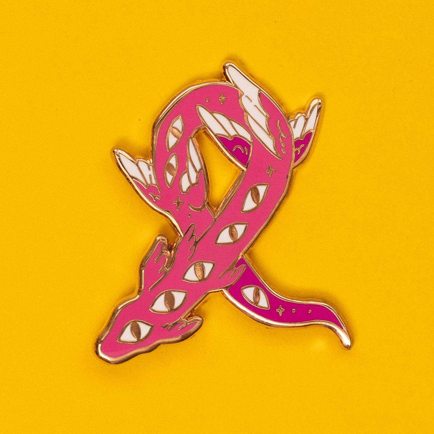 A holy serpent in pink, for breast cancer awareness. This pin is approximately 1.5 in (4 cm) long. The pin has hard enamel, rose gold plating, and two pin posts with rubber clutches.This listing is for standard grade pins only. Standard grade pins may have one or two tiny imperfections.