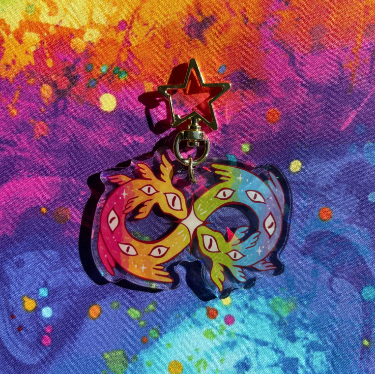 | Holy serpents in rainbow, for autism pride. This acrylic keychain is 2.5 inches (6.3 cm) long, double-sided with the same print on both sides. It has holographic material on one side. The keychain has a gold star clasp. |