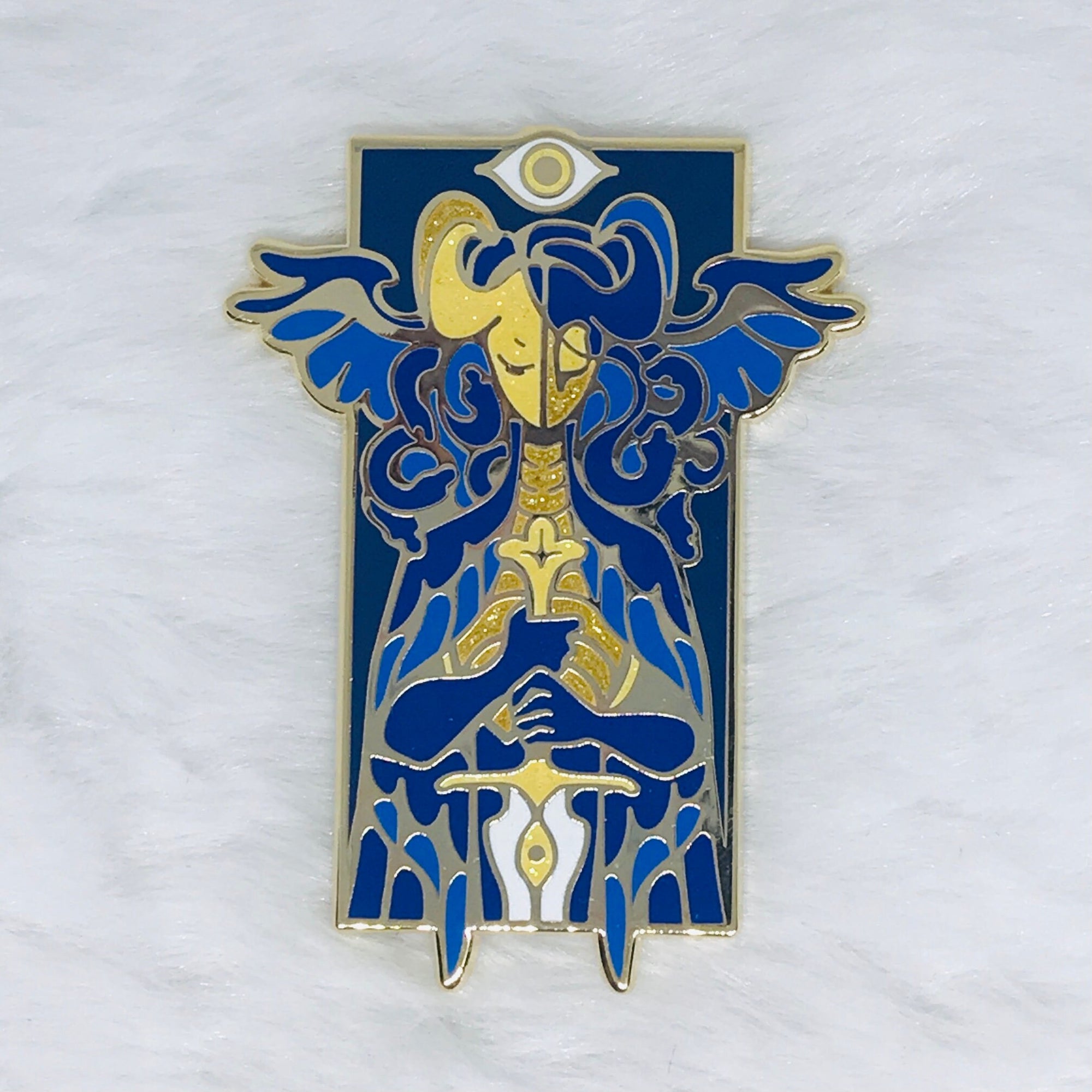 My rendition of Archangel Gabriel.The pin is 2 inches (5 cm) long. It is gold plated with hard enamel, and two pin posts with rubber backings. It has glitter accents.This listing is for mixed grade pins. You may receive a standard grade pin, which has minimal or no flaws; or a seconds grade pin, which may have more notable flaws. For my complete pin grading policy, please see my About & FAQ: linktr.ee/ultra.infinite