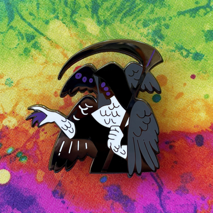 | This pin is 2 inches wide with black nickel plating. It has two pin posts with rubber backings, and hard enamel. These pins may not come with backing cards. |
