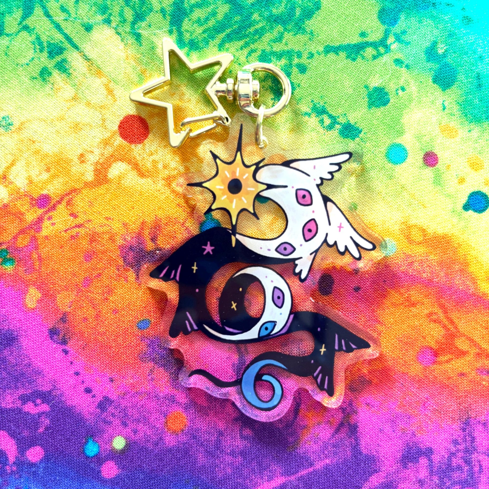 | This acrylic keychain is 2.5 inches (6.3 cm) on the longest side, double-sided with the same print on both sides; it has a gold star clasp. |